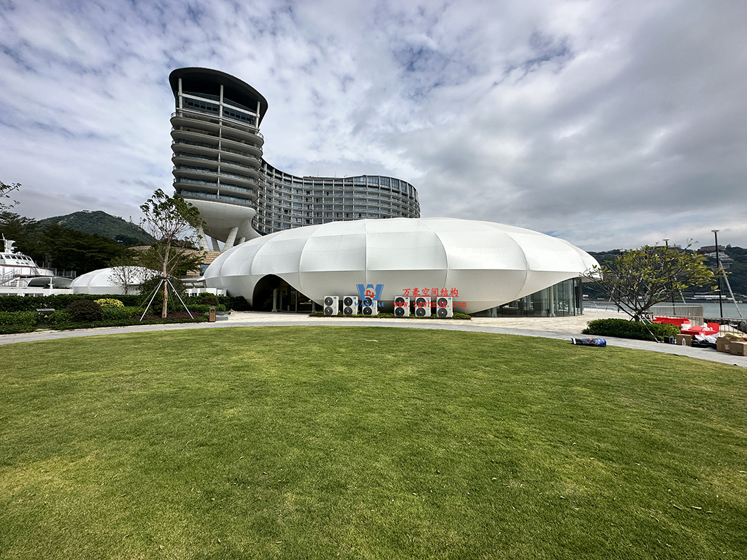 京基大梅沙酒店多功能活動廳鋼膜結構工程,該項目用鋼量約240噸,ETFE膜+PTFE膜展開面積約2834平米。