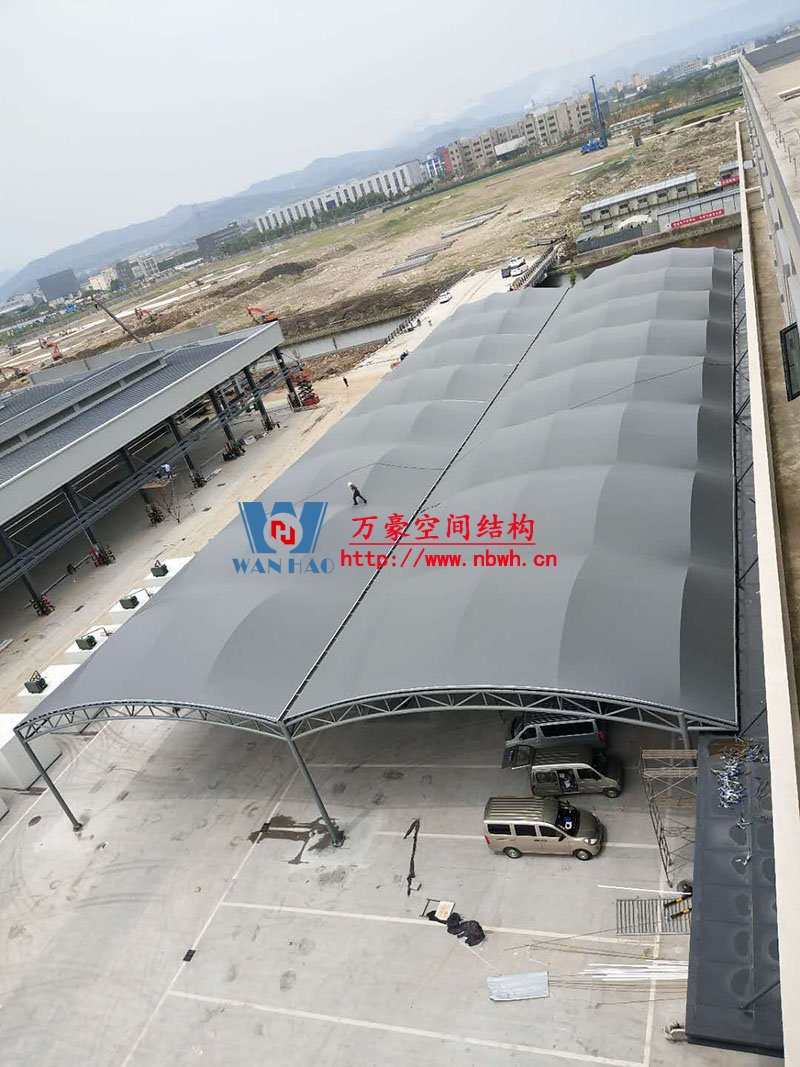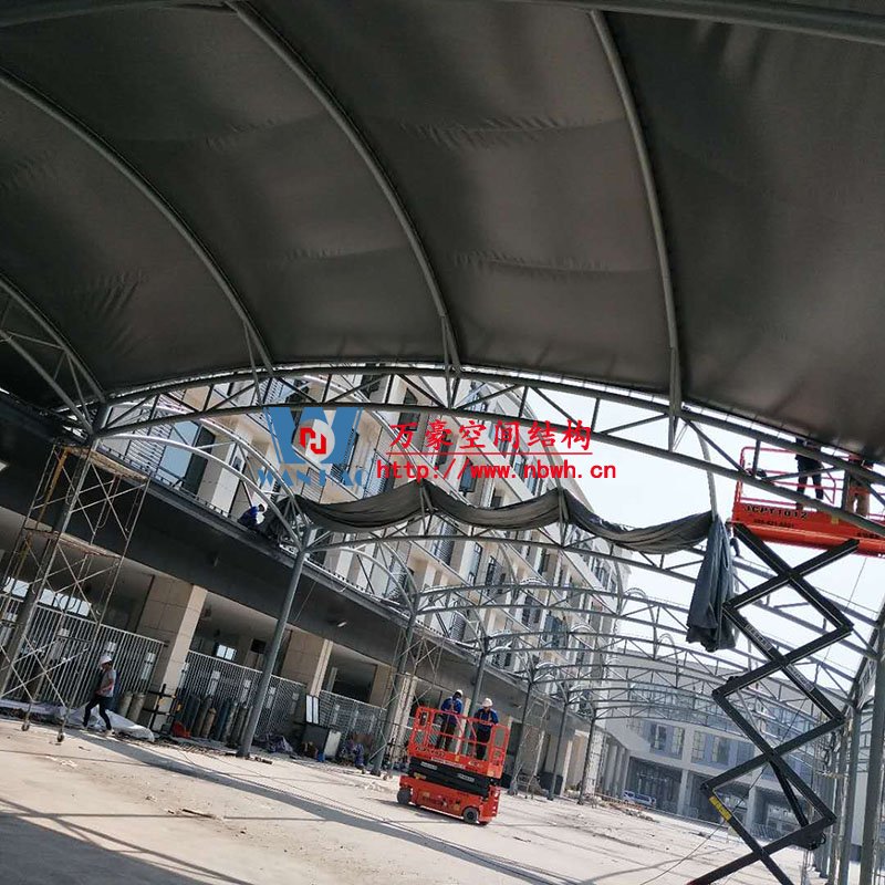 奉化方橋農(nóng)副鋼膜結(jié)構(gòu)雨棚工程位于浙江省寧波市奉化市內(nèi),此工程用鋼量100噸,膜結(jié)構(gòu)展開(kāi)面積3500平米,由寧波萬(wàn)豪空間結(jié)構(gòu)工程有限公司承建。