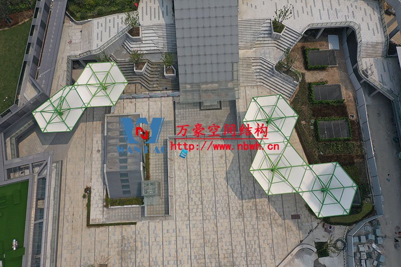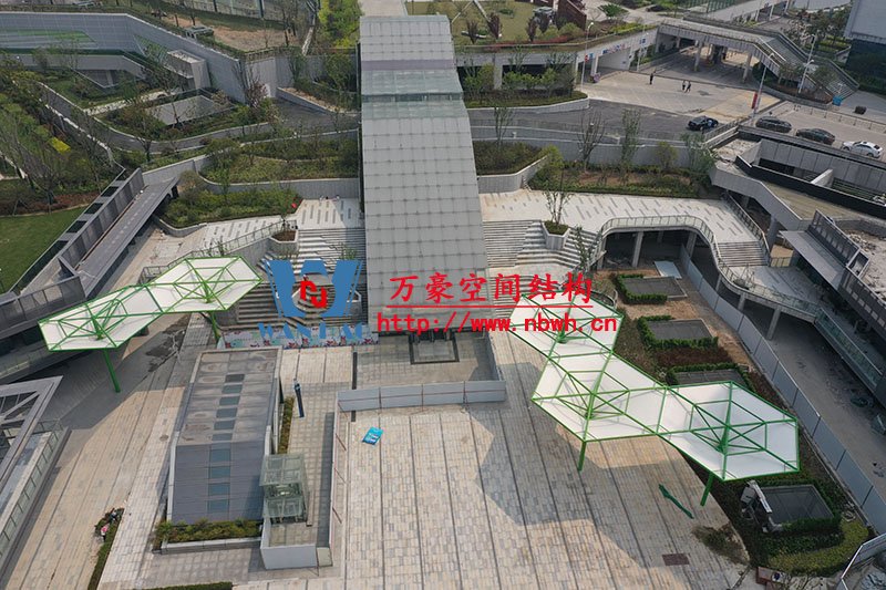 五鄉地鐵站傘狀PTFE膜結構項目位于浙江省寧波市楊柳郡,項目由19座倒傘膜結構組成,倒傘寓意盛開的牽牛花。該項目膜材使用進口PTFE膜材,膜結構展開面積5000平米,用鋼量100噸,由寧波萬豪空間結構工程有限公司承建。