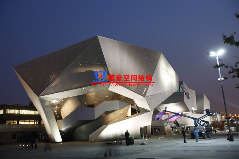 展館設計由自然景區和展館主題兩大部分組成。參觀者游歷和諧都市之旅從展館底層起落有致的自然景園開始。前往展廳入口的路也是等候區。這一路整個就像走迷宮一樣,要穿過不同的空間、隧道、空地和院落。入口在展館一層的斜坡景區內,通往展館城區展廳的大門在此為參觀者打開。穿過一條隧道,參觀者便踏進了和諧都市內設計布置奇妙的都市生活的體驗空間。展館由自然景區和展館主體組成,外墻包裹透明的銀色發光建筑膜,主體由四個頭重腳輕、變形劇烈、連成整體卻輕盈穩固的不規則幾何體構成,闡釋了“和諧城市”的主題。