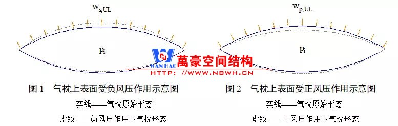 其中風(fēng)荷載是氣枕設(shè)計(jì)時(shí)一個(gè)主要涉及的荷載類型,但很多設(shè)計(jì)人員在進(jìn)行膜面強(qiáng)度校核時(shí)并不知如何正確的進(jìn)行風(fēng)荷載的施加,亦不甚了解氣枕受正風(fēng)壓作用和負(fù)風(fēng)壓作用有什么區(qū)別(見(jiàn)圖1,圖2),部分設(shè)計(jì)者由于計(jì)算軟件的缺乏并不能獲得風(fēng)荷載作用下的氣枕內(nèi)壓,常常直接采用風(fēng)荷載值作用于受風(fēng)膜面進(jìn)行計(jì)算,或采用風(fēng)荷載和氣枕初始內(nèi)壓直接疊加施加于受風(fēng)膜面進(jìn)行計(jì)算。但因?yàn)闅庹硗ǔ0?、下層兩層柔性的膜面及相?duì)封閉的膜氣腔內(nèi)的空氣,在風(fēng)荷載作用下這三者必將發(fā)生聯(lián)動(dòng)反應(yīng):膜面發(fā)生較大的形態(tài)變化,即氣枕體積發(fā)生變化,氣枕內(nèi)壓的也必然會(huì)隨之發(fā)生變化,氣枕膜面也必然處于風(fēng)荷載和其內(nèi)壓共同作用。
