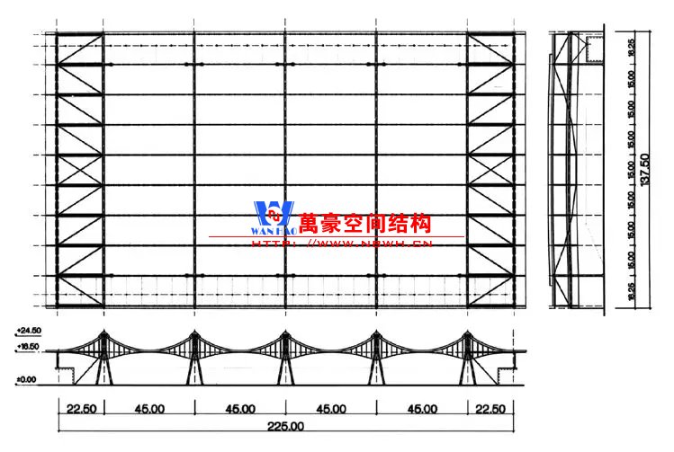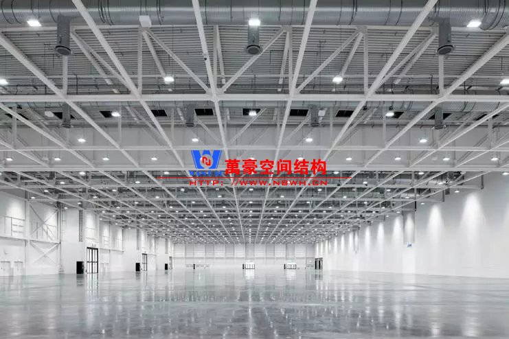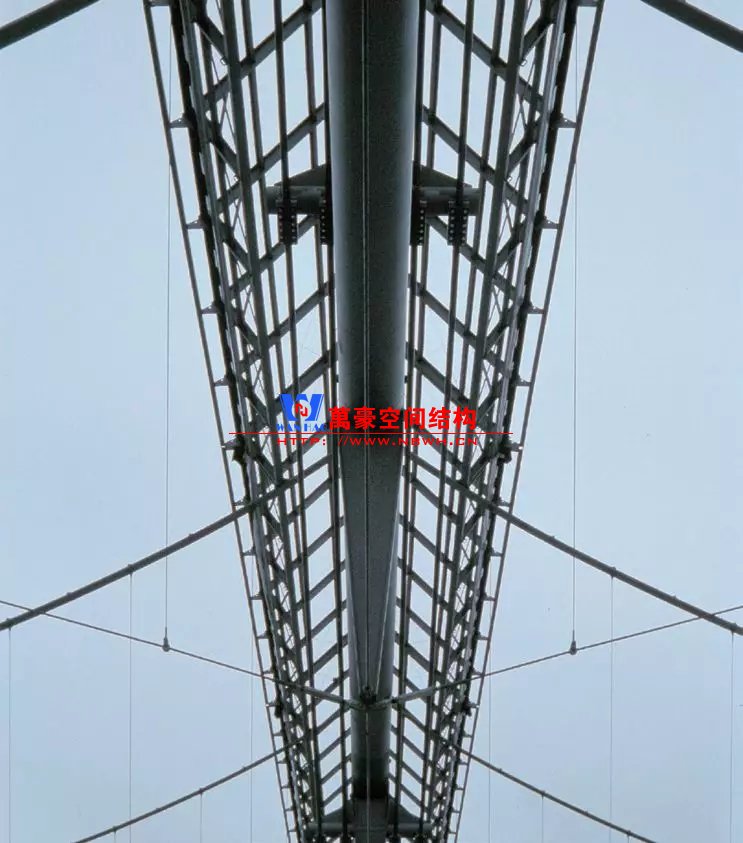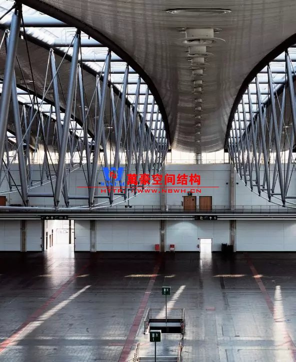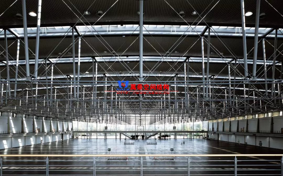 4號展廳的屋蓋采用了跨度122m、高度為9m的張弦桁架結構,并支承于兩側三層高的鋼筋混凝土結構墻體上。富有秩序的結構桿件有效地劃分了這個巨大的無柱空間。上弦是兩根直徑為500mm的熱軋無縫鋼管,下弦是兩根直徑為75mm的全封閉鋼絞線,與兩端鉸接的直腹桿和交叉索斜腹桿共同組成了索桁架體系。比起傳統的張弦梁,其上弦所受的彎矩很小,從而可以采用更纖細的截面,獲得結構的輕盈感和良好的經濟性。