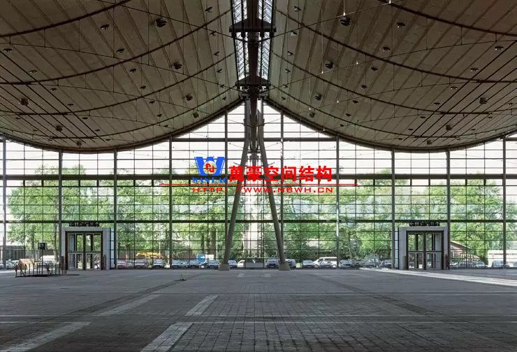 126m的跨度在2001年被譽為“中國第一跨度”。結構設計中采用了一系列措施讓這個“中國第一跨度”在確保建筑意圖的前提下得以高效實現。大型屋面采用下張弦體系減少鋼梁彎矩,為了獲得與鋼箱梁匹配的剛度,下弦采用了直徑最大為150mm的高強鋼拉桿,這一設計也間接推動了國內自主高強鋼拉桿的高速發展。施工過程中采用了先滑后固的方式釋放了自重下的柱腳水平推力,減少結構內力。采用連續梁檁條,大幅度降低了30m跨度檁條的用鋼量。