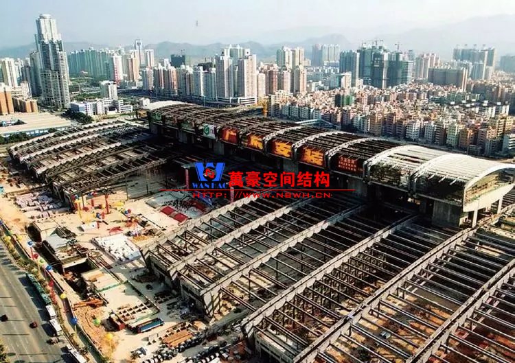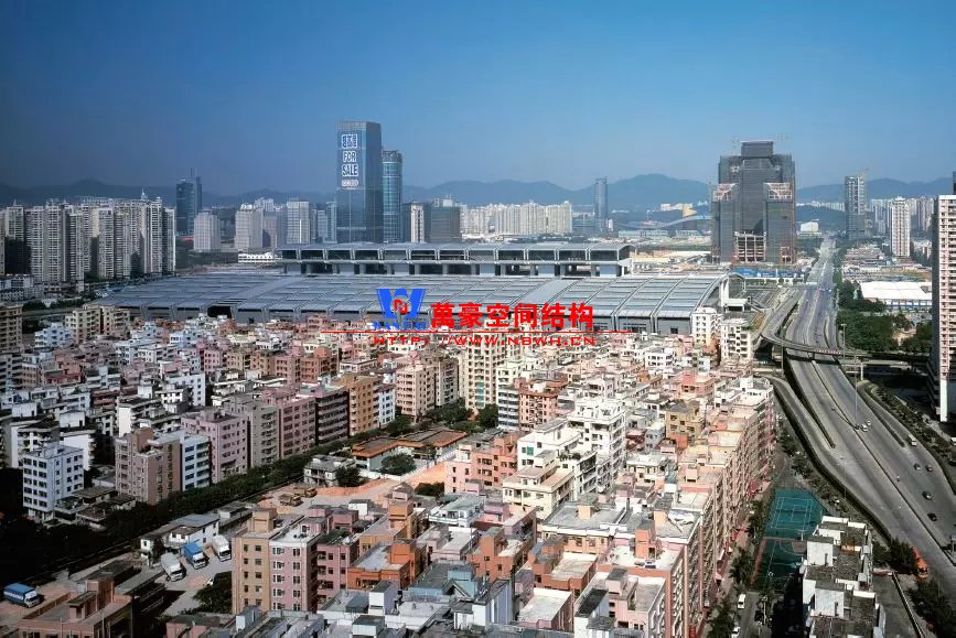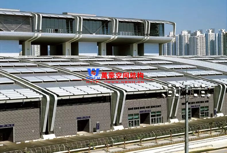 展覽廳屋蓋結構由35榀巨型雙箱梁組成,每榀梁結構跨度126m,一端與地面鉸接,另一端與標高約30m處的混凝土柱牛腿鉸接。gmp和sbp共同的設計目標是塑造一座簡樸自然而清晰的建筑,盡可能地耐久且減少后續維護。與漢諾威4號展廳的結構理念類似,采用雙梁構件來劃分大尺度空間,從而形成有秩序的結構體系,采用箱型截面構件則是為了用純粹的語言去表現建筑的張力,突出線條感。從設計之初就秉承一個理念:整個建筑語言是無法通過“輕巧”的桁架結構加上外表皮來表達的,只有通過富于設計感的外露結構構件本身來表達。超過15年時間的深圳會展中心至今依然優雅經典,這一設計理念也得以印證。