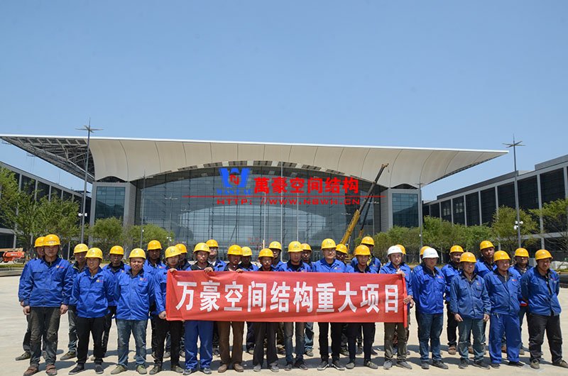 除了立柱和水平連接桿之外,所有的結構桿件均為柔性索或鋼板帶,雖然這樣的新型體系大大減少了結構用鋼量,但同時也給設計和施工帶來了巨大挑戰。通過精細和嚴謹的受力找型、結構有限元多方位分析、嚴格而準確的位型及精度控制和安裝分析,最終成就了這座大跨柔性體系展廳。