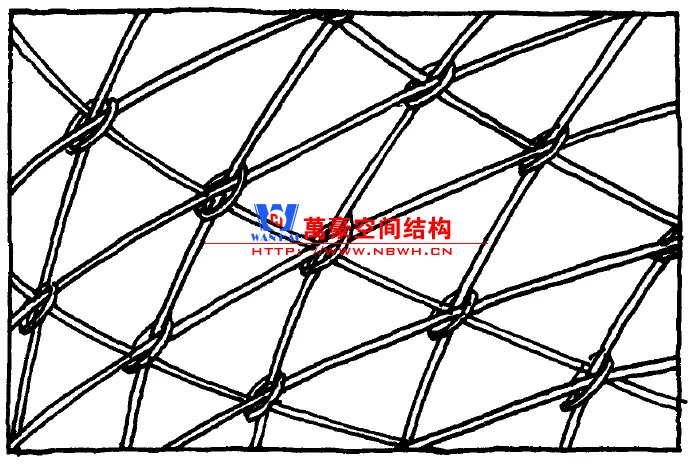 施萊希采用了四邊形網格劃分的球殼。網格桿件承擔軸力,增設拉索拉結對角節點,保證四邊形網格的穩定性。