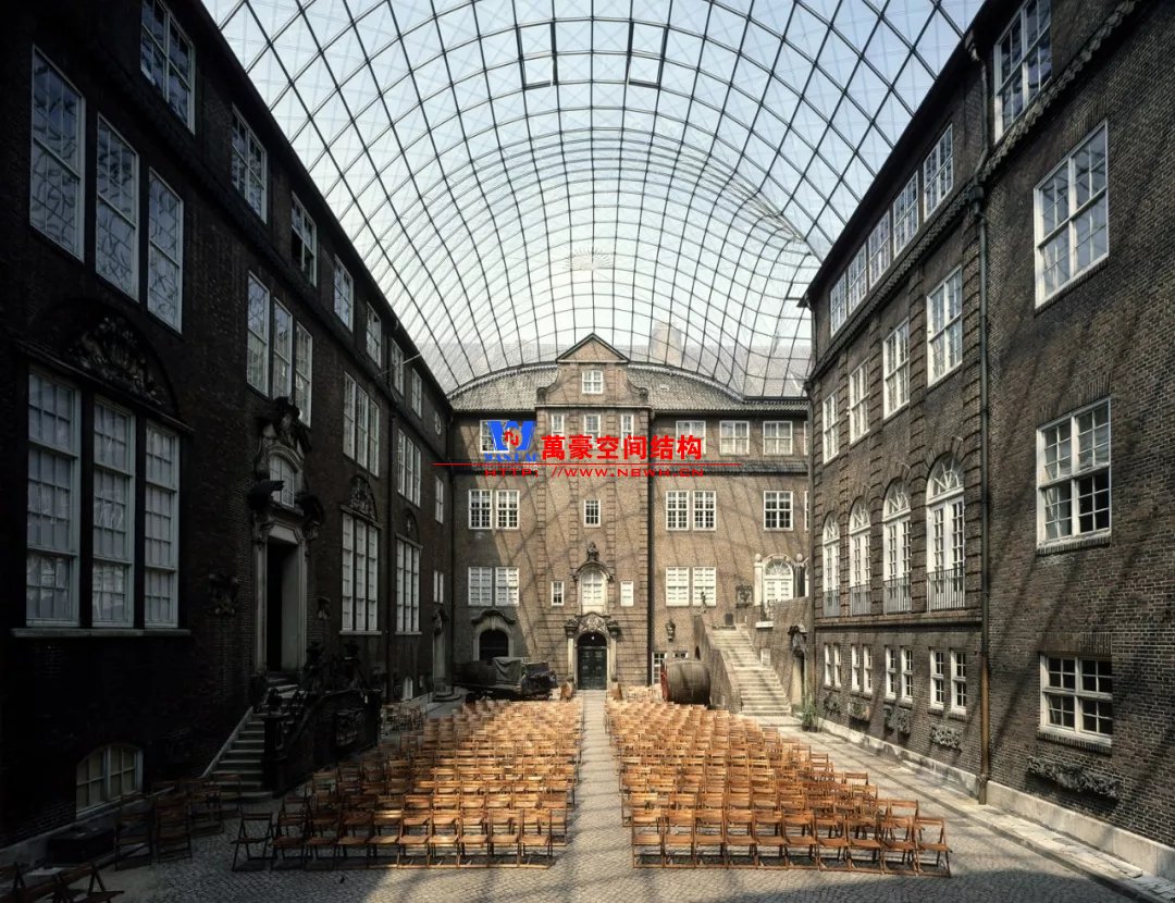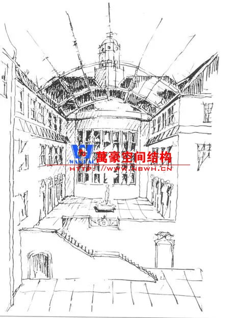 漢堡博物館中庭要加建一個頂棚。中庭平面呈L形,一端寬度14m、一端寬度17m。