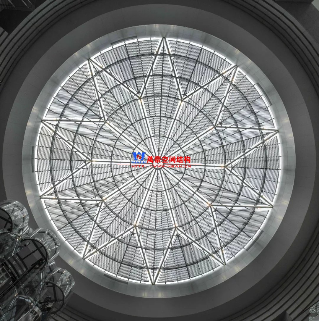 天窗位于交通中心地下一層圓形中庭上空,人流在這里交匯,在選擇結構網格布置時需要考慮其向心匯聚效應,因此方向性較弱的施威德勒網格和凱威特網格就不適合。