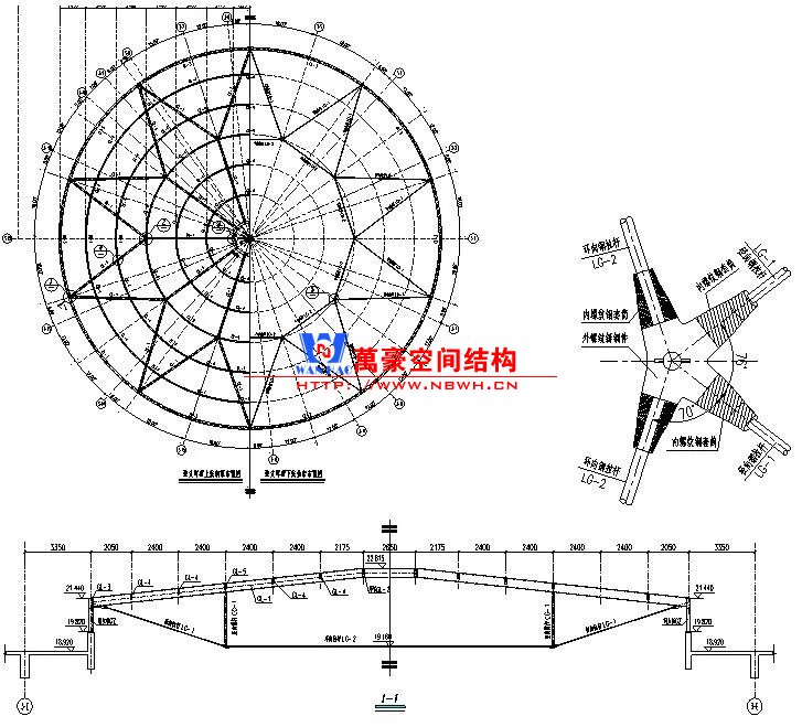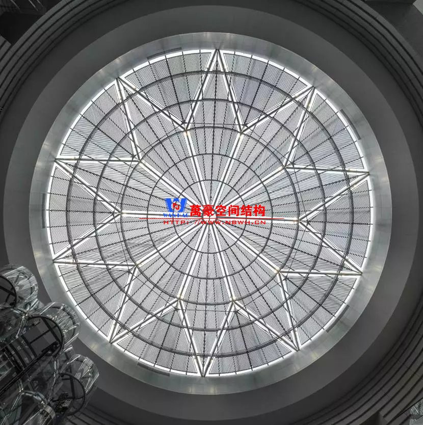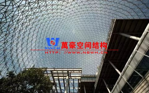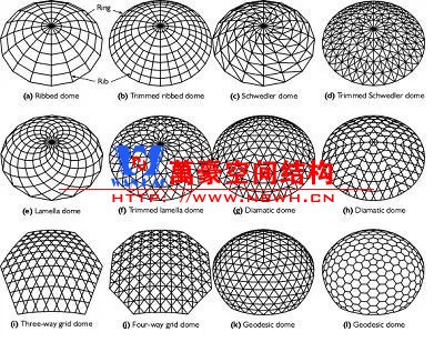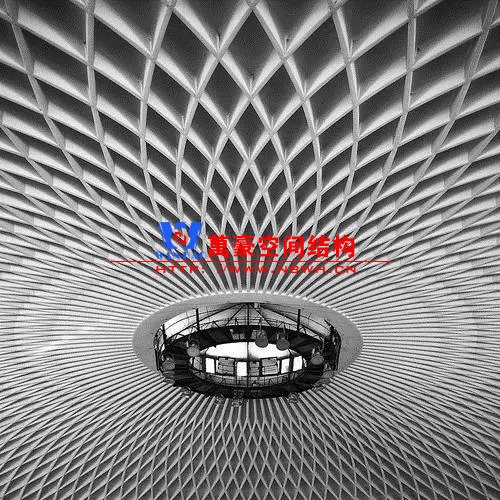 還是用鋼結構比較穩妥。要用鋼結構表現天窗的輕盈,網殼是一個很好的選擇。經典的網殼劃分方法有很多,比如肋環型、聯方型、施威德勒型、凱威特型等等。其中肋環型適合中、小跨度;聯方型抗風抗震性能相對更好,適用與大、中跨度;施威德勒型能承受較大的非對稱荷載,適用于大、中跨度;凱威特型為均勻的三角形網格,適用于各種跨度。