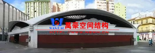 再比如托羅哈1933年在瑞士設計的阿赫西拉斯鎮集市屋面。正八角形穹頂直徑達47.6m,曲率半徑為44.2m。作為單一的球殼,它的跨度第一次超越了萬神廟穹頂。殼體厚度最小為8.9cm,厚跨比是1/535;支承點附近加厚至45.7cm。