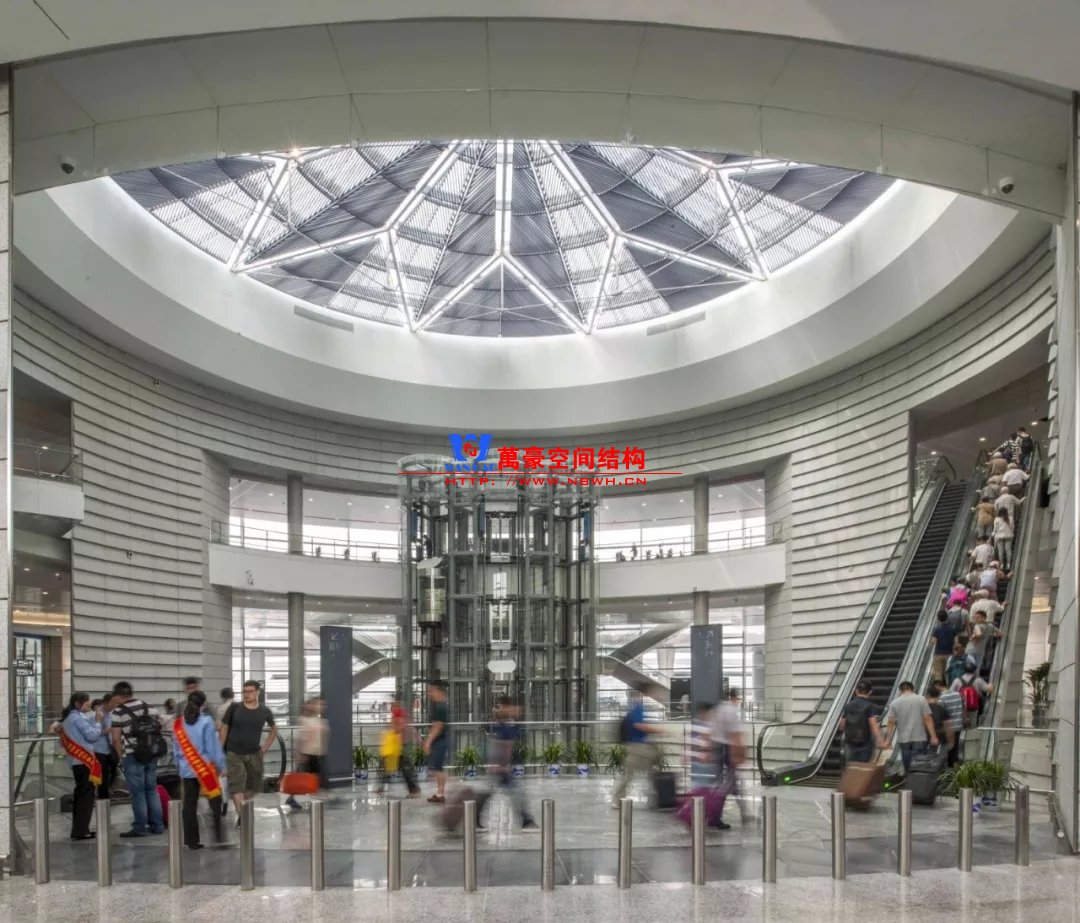 這是某機場交通中心中庭的一個圓形天窗,天窗直徑30米。如果讓我們隨便設計,有哪些方法可以填滿這個圈呢,我們來看下。