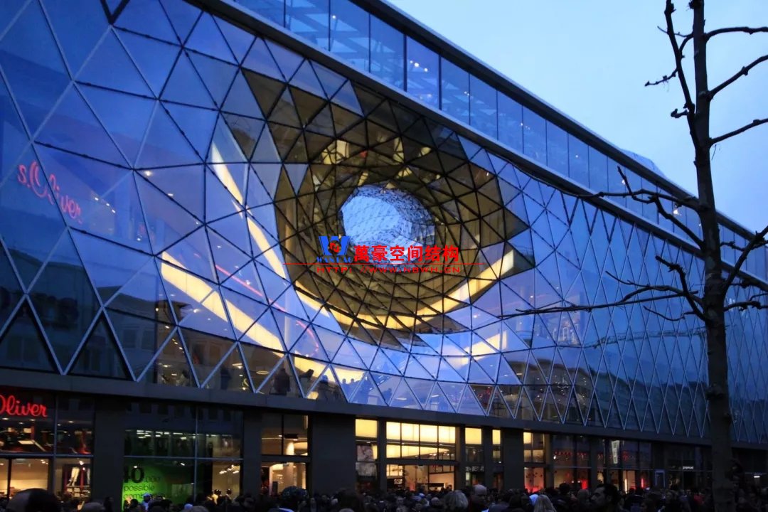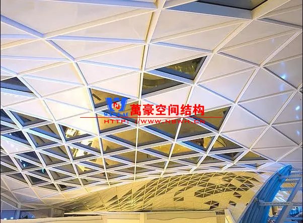對于跨度比較小的天幕,采用單向梁或交叉梁即可實現。這一類天幕的結構創新主要體現的網格布置、截面形式和節點細節方面。例如,網格布置可以是三角形、四邊形、聯方形、六邊形等等。
