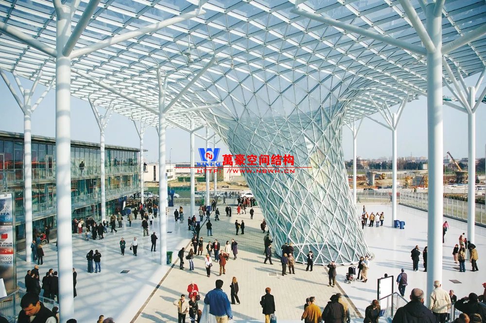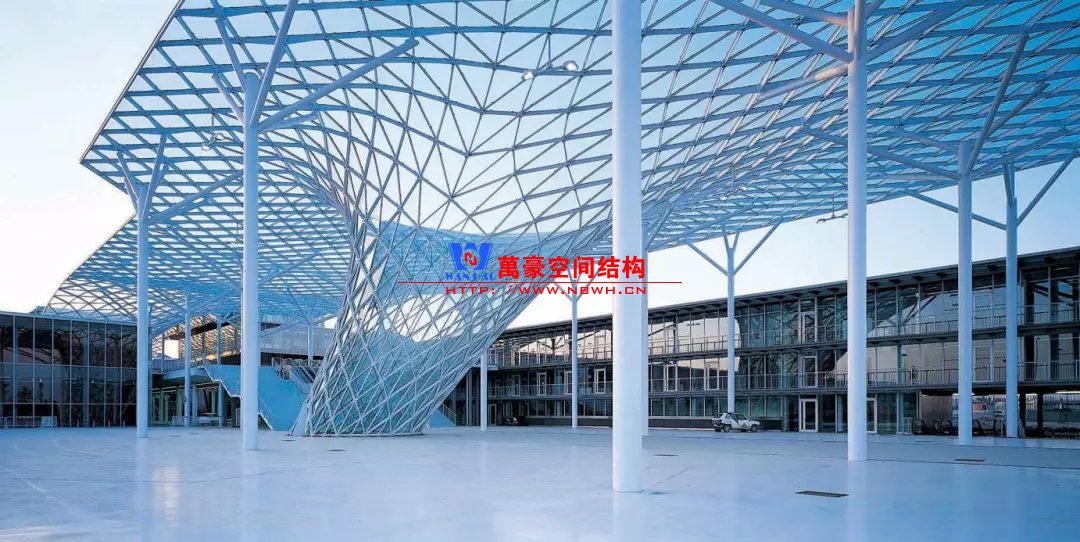 有的天幕雖然設計為曲面,但其曲面形狀的力學性能差,結構受力仍然以抗彎為主。這類曲面天幕結構與樹形柱相結合,才能以較細小的結構構件完成。