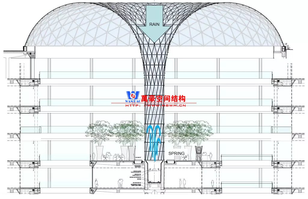 巨大透明天幕能增強自然采光和視覺通透性,然而另一方面,也帶來眩光和太陽熱輻射增加等潛在問題。因此,設計師采用低輻射鍍膜玻璃、通風裝置和氣簾、雨水收集系統等兼顧了訪客的最佳舒適度和綠色生態品質。