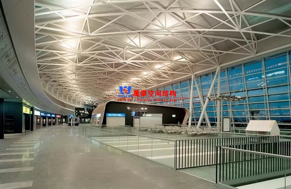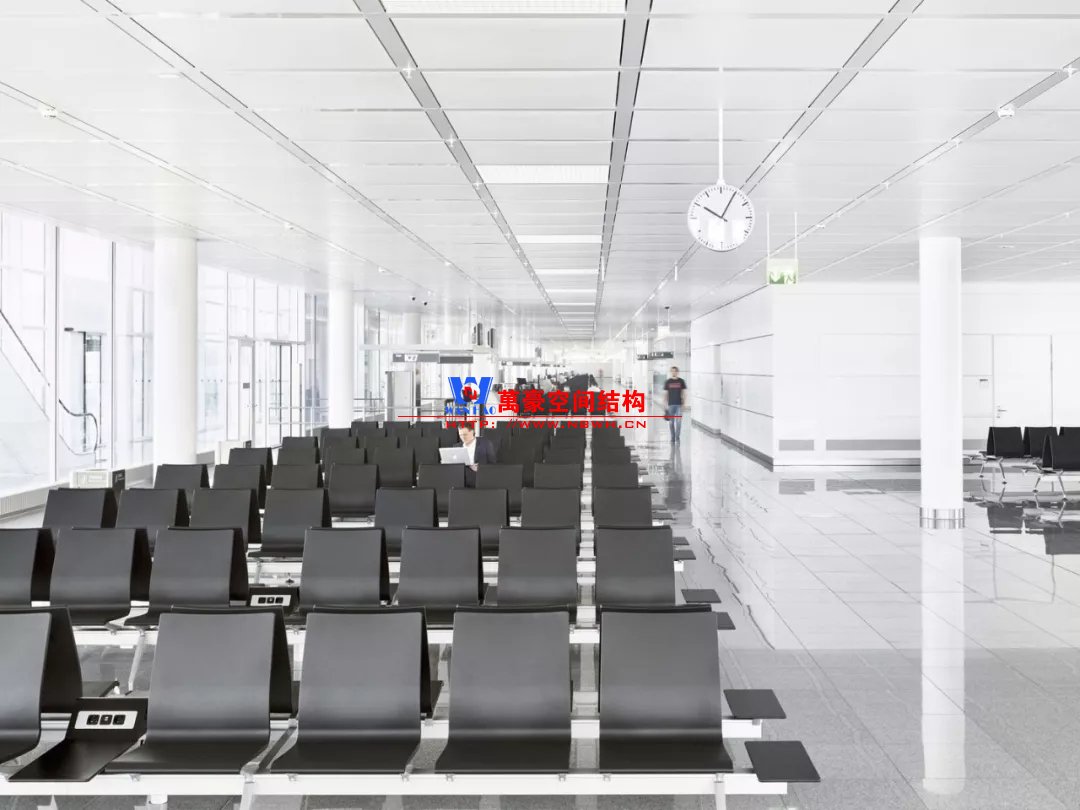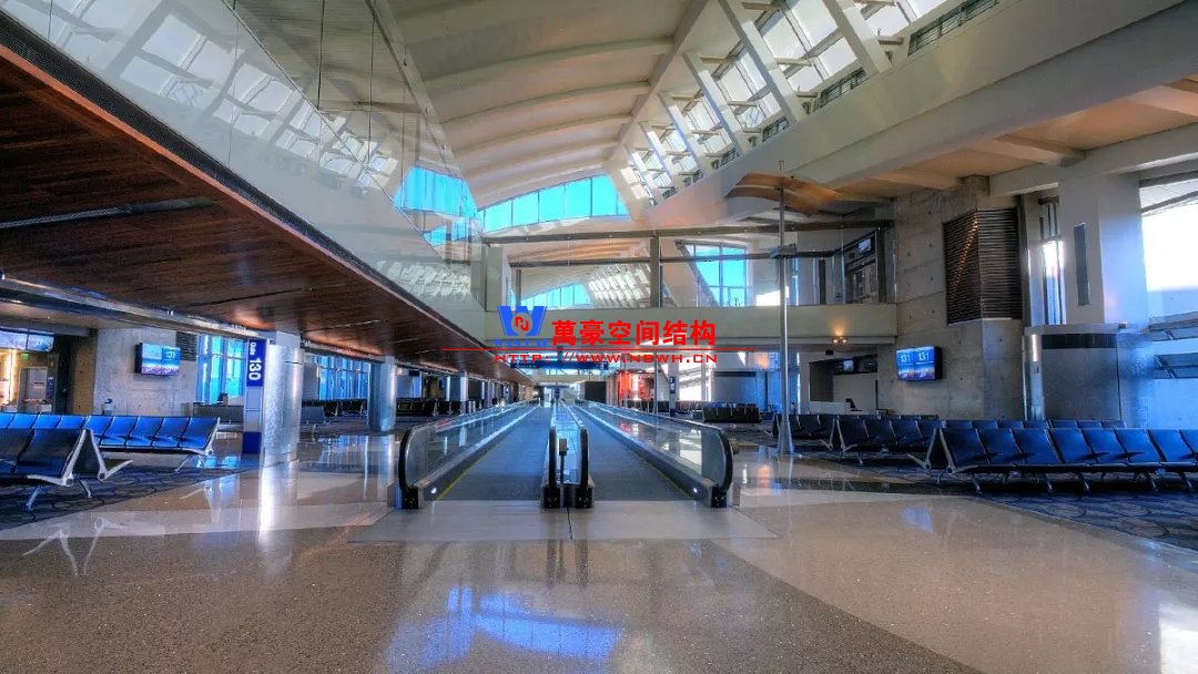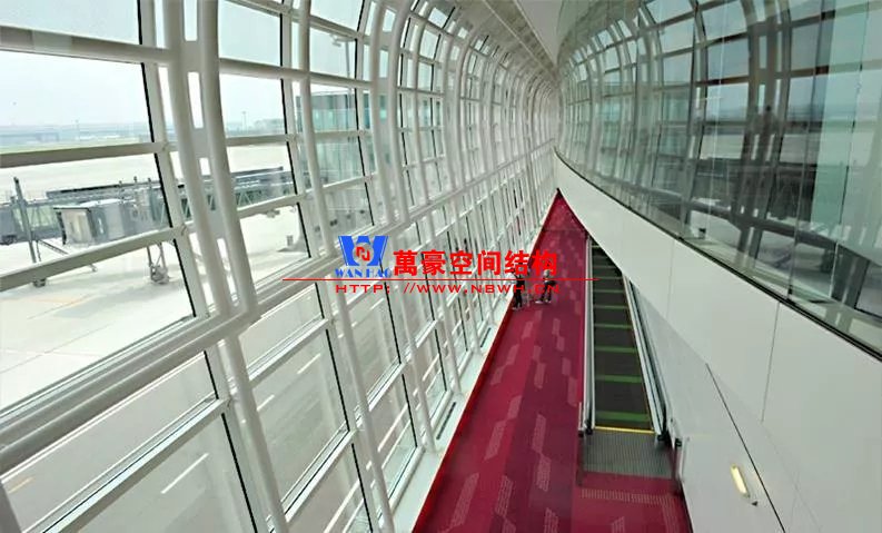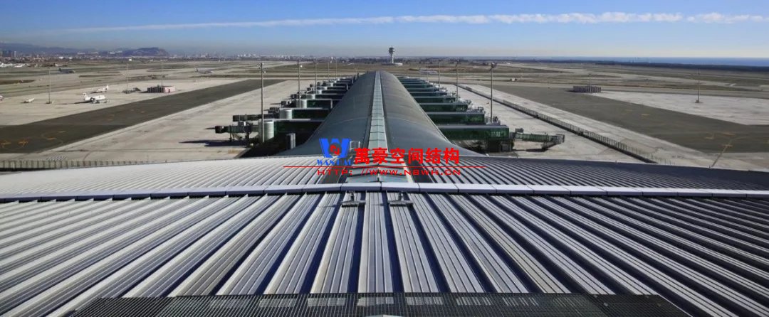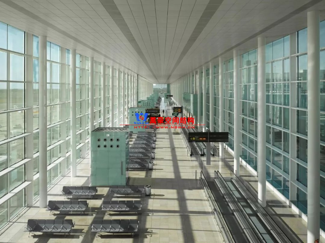 如巴塞羅那機場的指廊就是采用簡單的鋼框架結構體系,鋼柱布置于兩邊;幕墻采用剛性幕墻,貼近鋼柱外側布置;室內吊頂無天窗,吊頂走向沿長向,空間上有指向性。