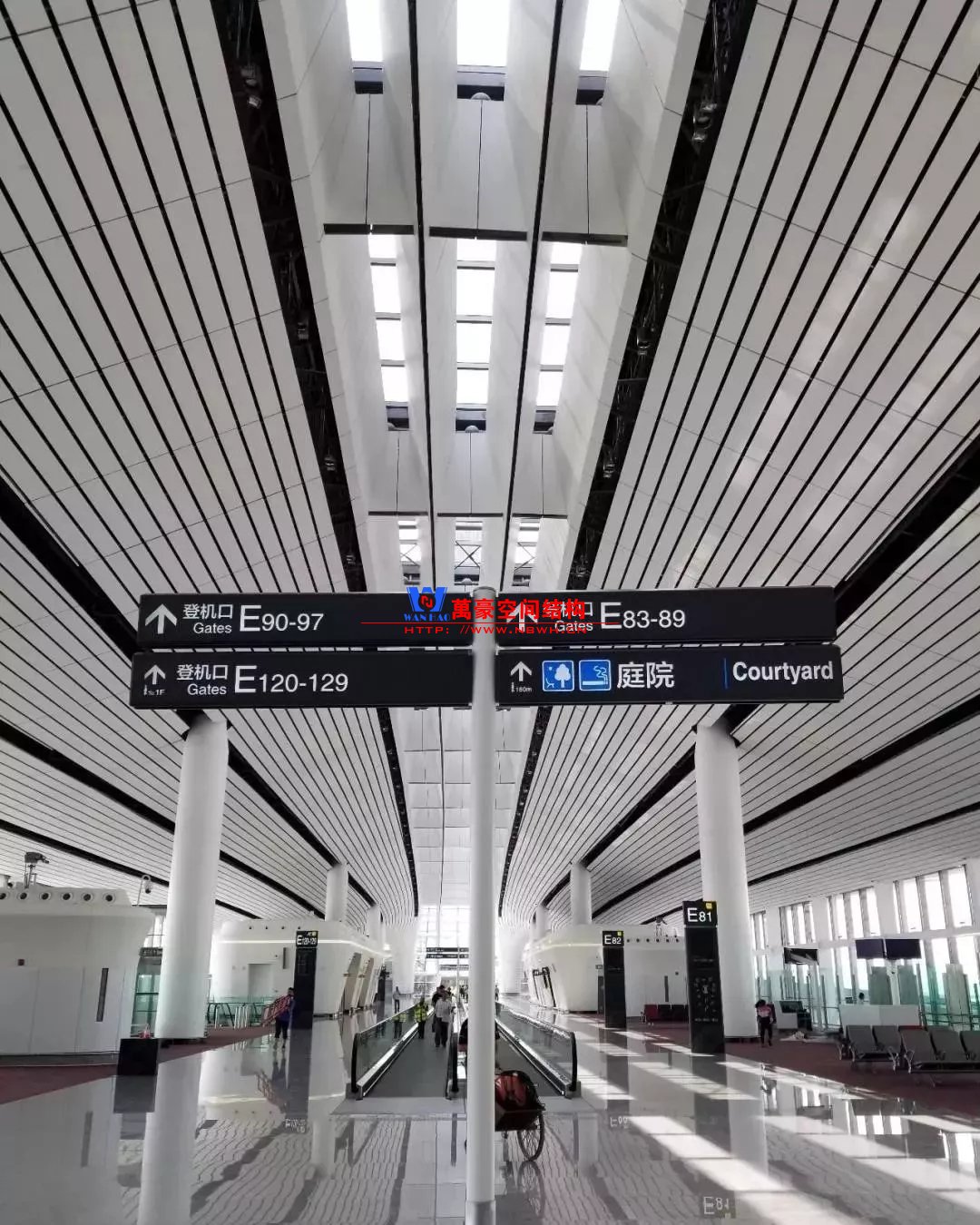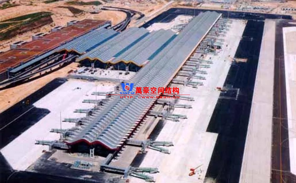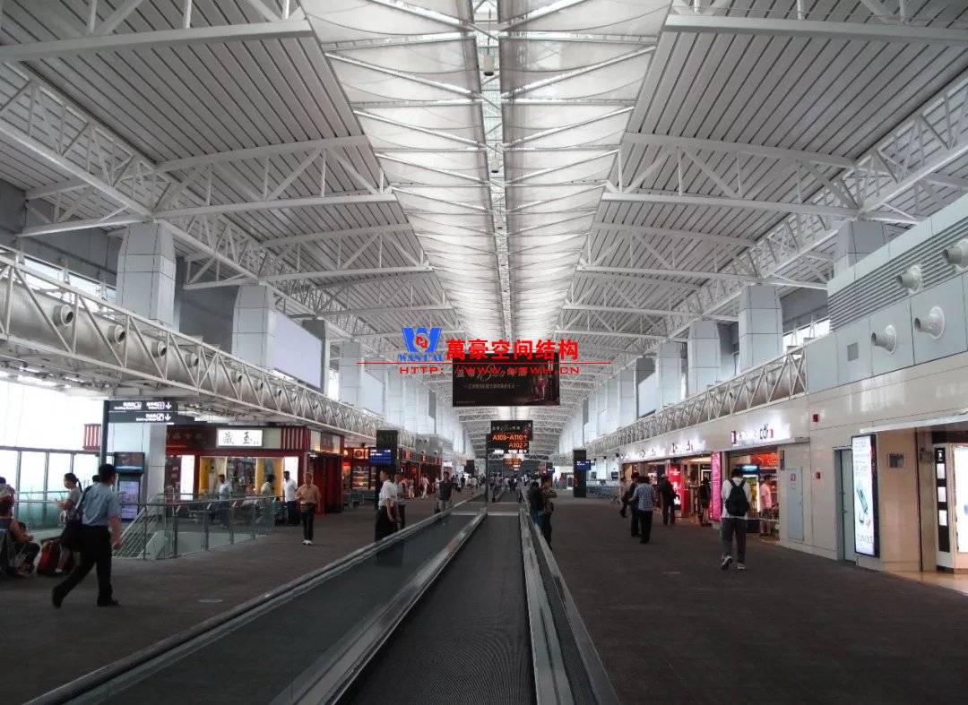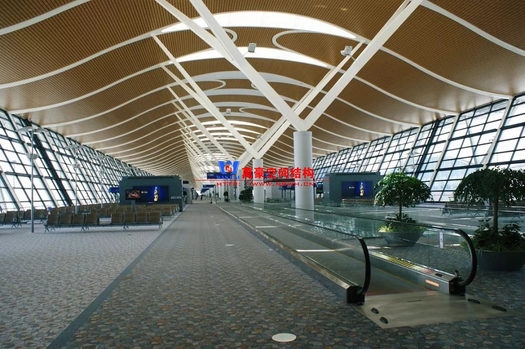 如巴塞羅那機場的指廊就是采用簡單的鋼框架結構體系,鋼柱布置于兩邊;幕墻采用剛性幕墻,貼近鋼柱外側布置;室內吊頂無天窗,吊頂走向沿長向,空間上有指向性。