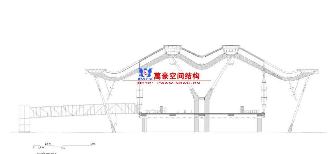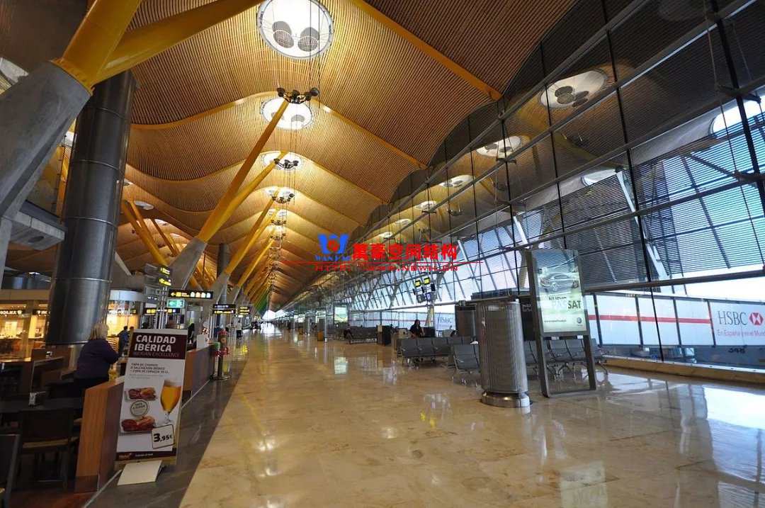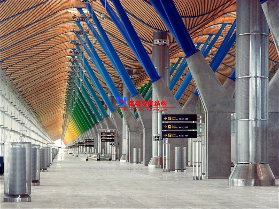 我們還可以讓平頂有些起伏變化來增加室內效果,比如經典的馬德里機場。指廊的剖面采用M形,為了應對曲梁帶來的不利影響,工程師在中部布置了兩組Y形柱支撐于轉折點。