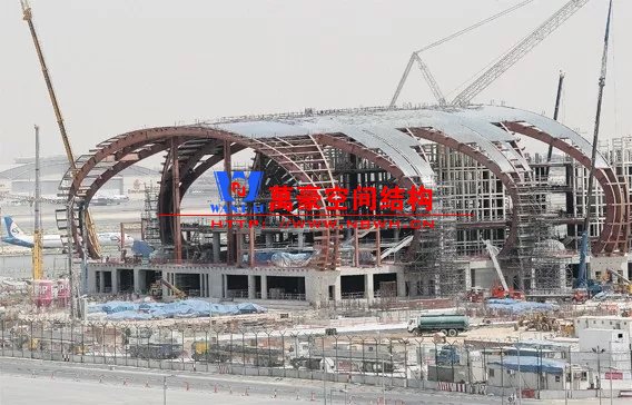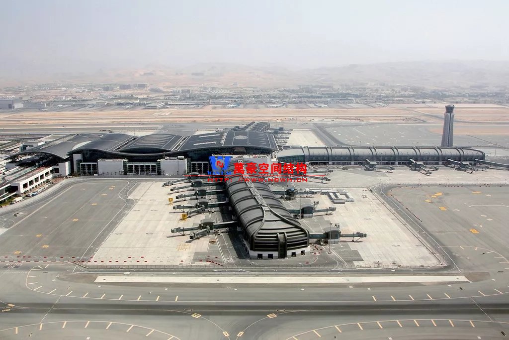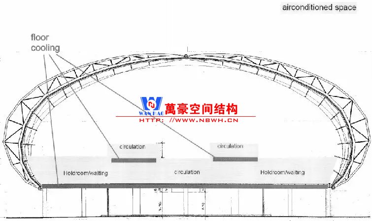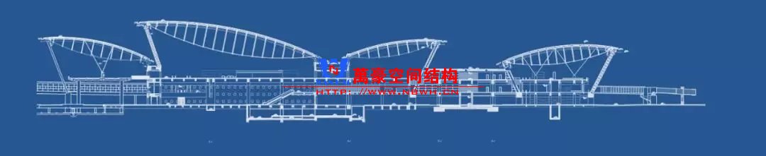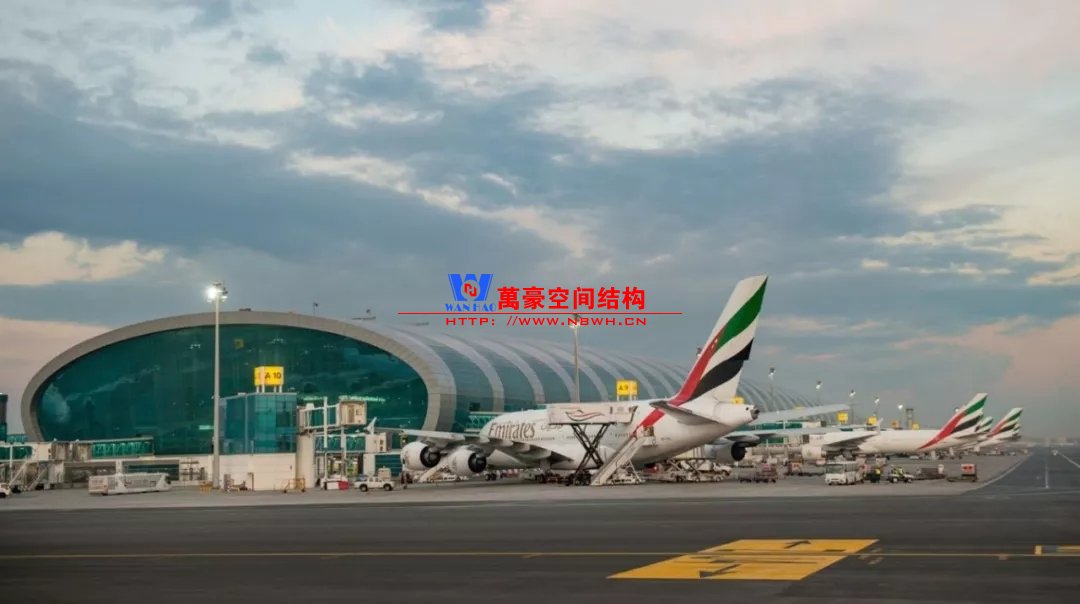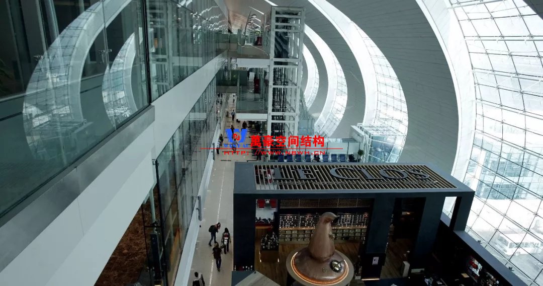 無獨有偶迪拜機場也是采用相似的外形,但是由于剖面并不是一個完整的拱形,因此構件內彎矩作用會比較明顯,因此在室內布置了兩根柱子。立面幕墻則采用索桁架半剛性幕墻立面更加通透。與雙流機場不同,結構構件是吊頂外包的,因此外包區域采用了效率更高的主次梁體系。