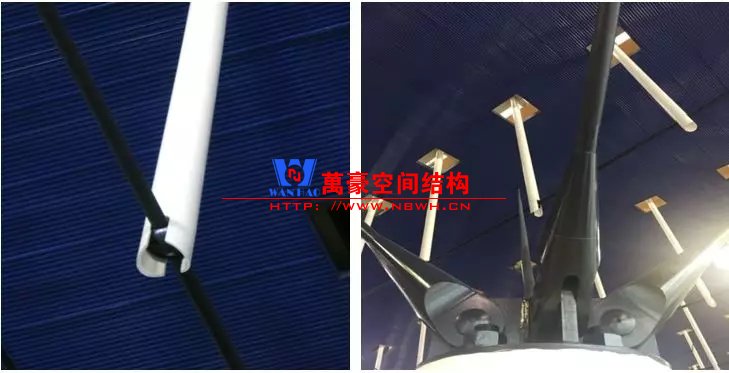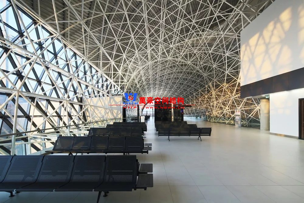克羅地亞札格瑞布機場剖面也是筒形,結構采用網架結構,但網架沒有外包。網架構件和網架球節點直接暴露在近人的尺度,但從照片上看并沒有顯得很雜亂,這可能是因為結構構件和節點的尺度控制的很好,細而密的構件顯得比較精細。