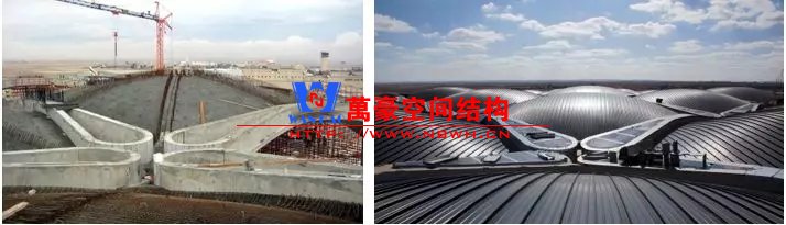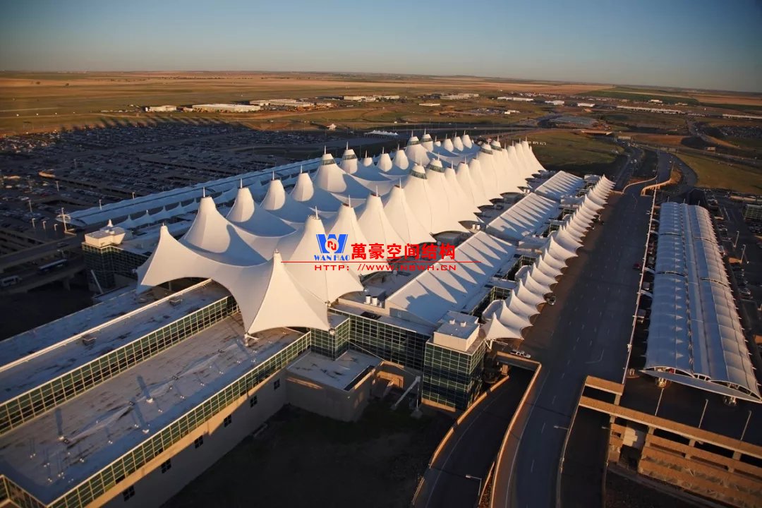 除了以上相對比較常見的結構類型,還有一些是不太常見的樣式,且基本上只此一例別無他家。如丹佛機場則采用了膜結構,潔白的膜層層疊疊與遠處的雪山交相呼應,建筑效果很特別。那為何很少有機場大范圍采用膜結構呢?可能和膜結構的熱工性能和使用年限有關系,夏熱冬冷不節能。同時膜結構對形態的適應性比較差,需要特定的建筑樣式才能遷就膜結構,而不像鋼結構基本能適應任何建筑造型。因此建筑師如果想選擇膜結構,需要和結構工程師在早期有更多的溝通。