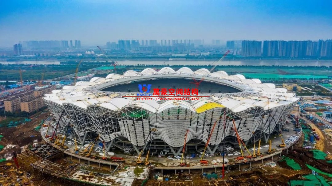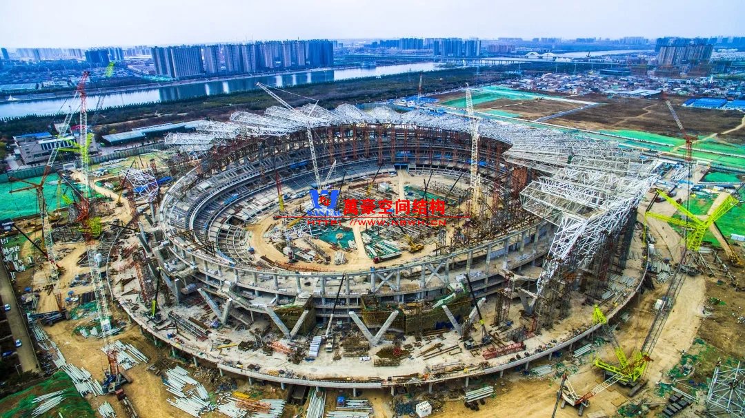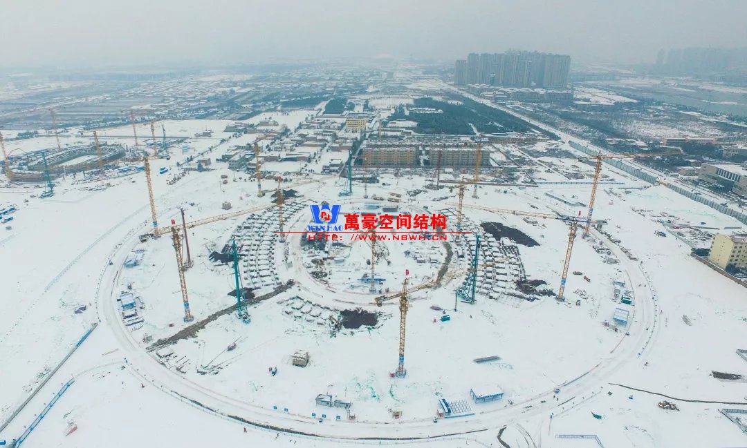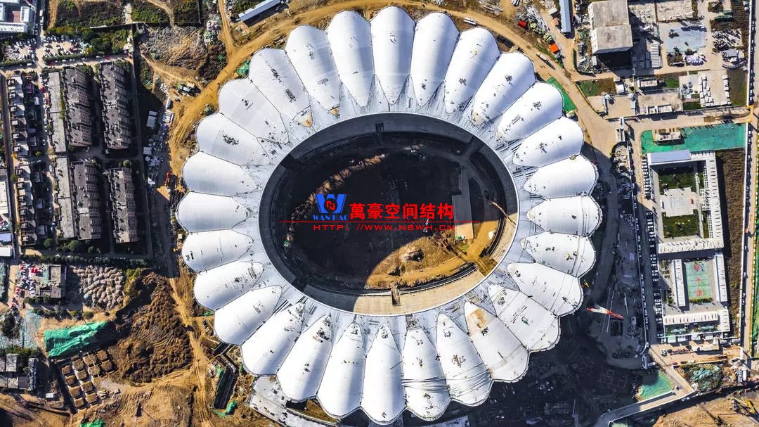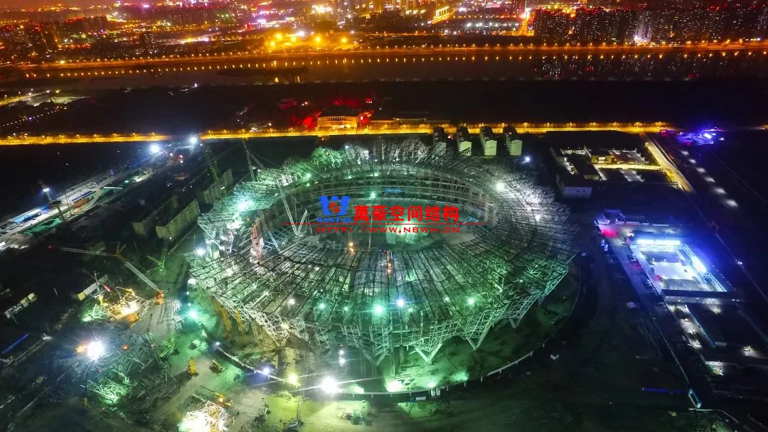體育場罩棚整體造型呈馬鞍形,采用空間管桁架懸挑結構體系,南北長332m,東西寬316m,罩棚最高58.3m。2019年1月1日首吊,鋼結構分包中建鋼構歷時87天,消耗近5萬工日、逾5千機械臺班,完成168單元、9500噸罩棚鋼桁架吊裝工作,于3月28日提前合攏。
