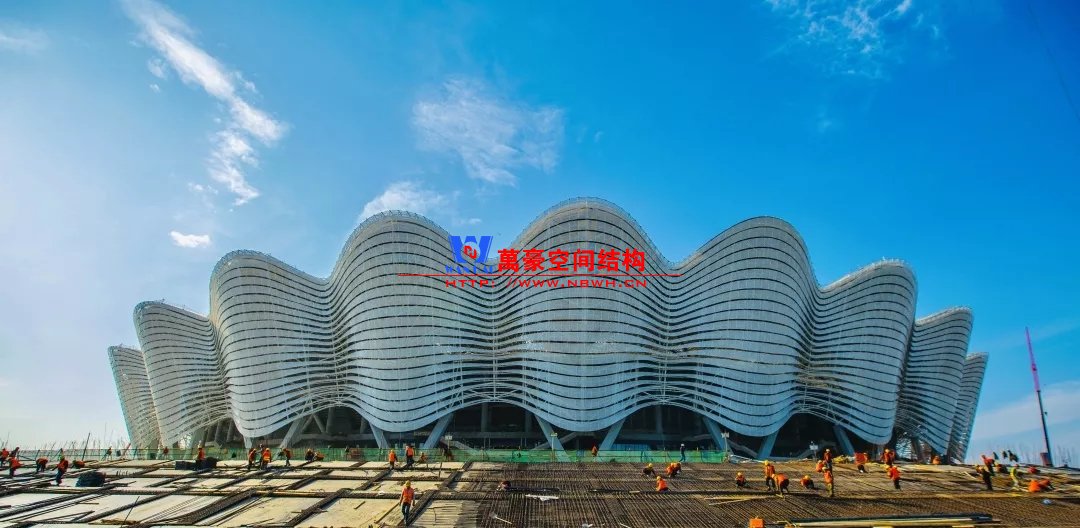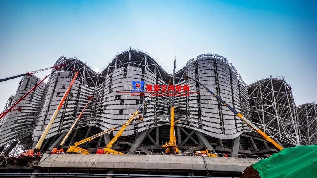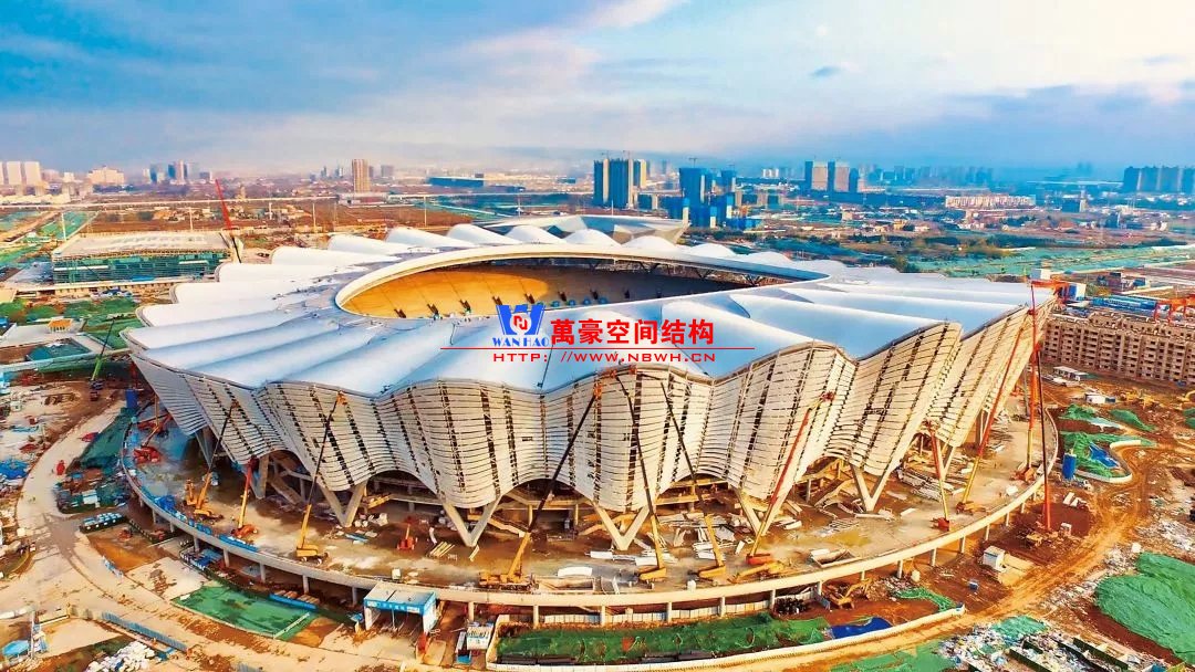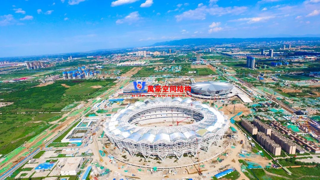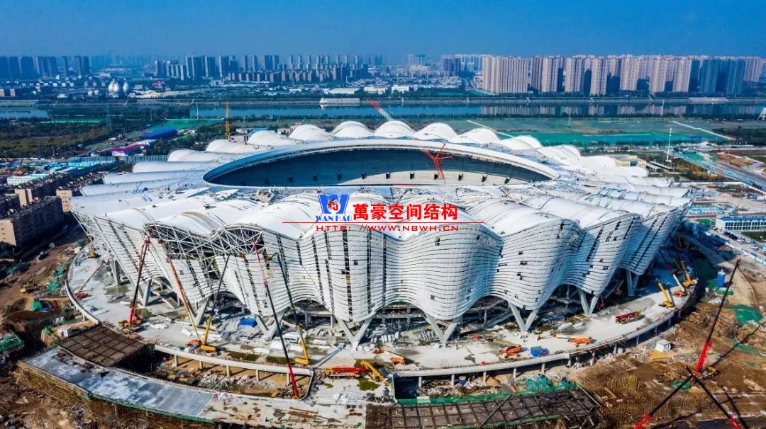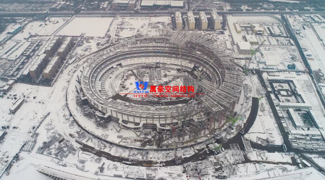 體育場罩棚整體造型呈馬鞍形,采用空間管桁架懸挑結構體系,南北長332m,東西寬316m,罩棚最高58.3m。2019年1月1日首吊,鋼結構分包中建鋼構歷時87天,消耗近5萬工日、逾5千機械臺班,完成168單元、9500噸罩棚鋼桁架吊裝工作,于3月28日提前合攏。