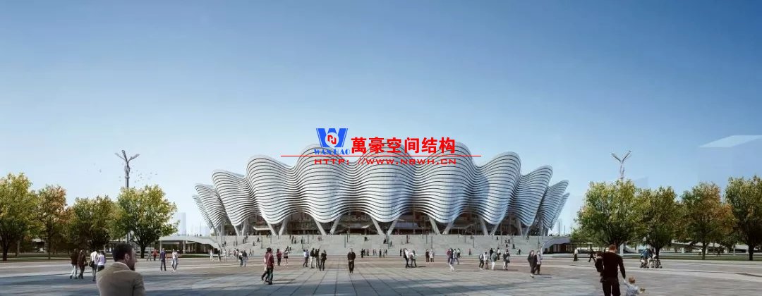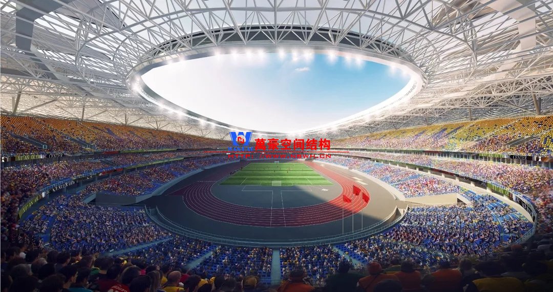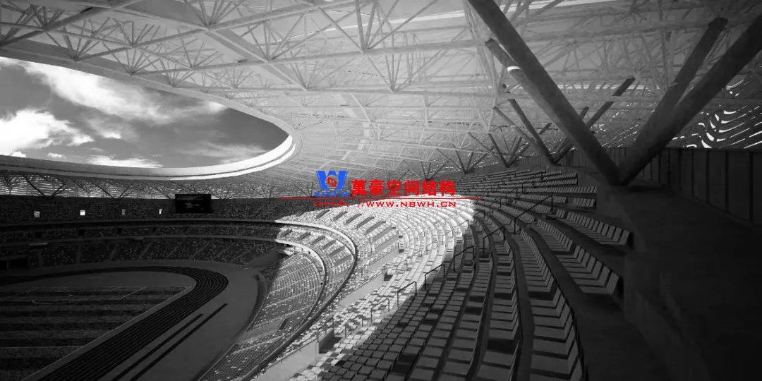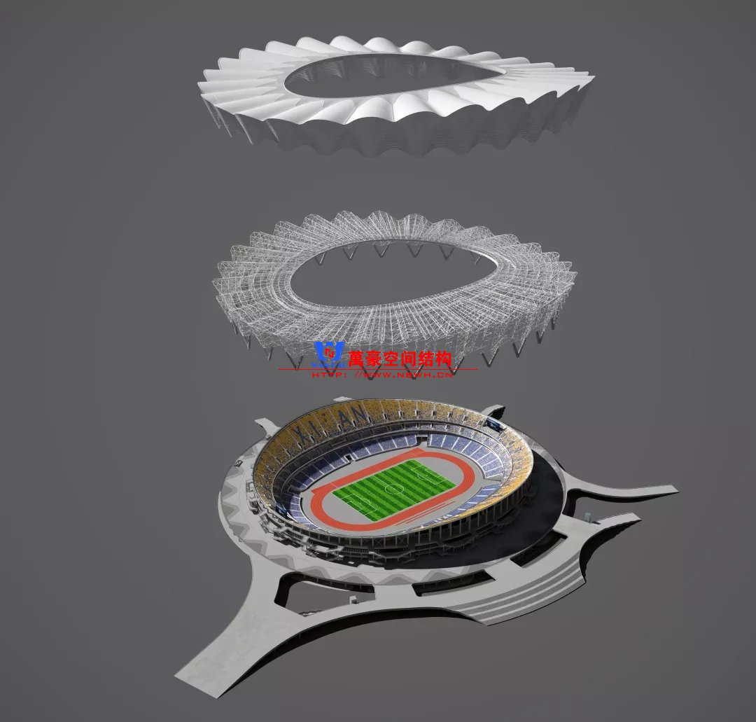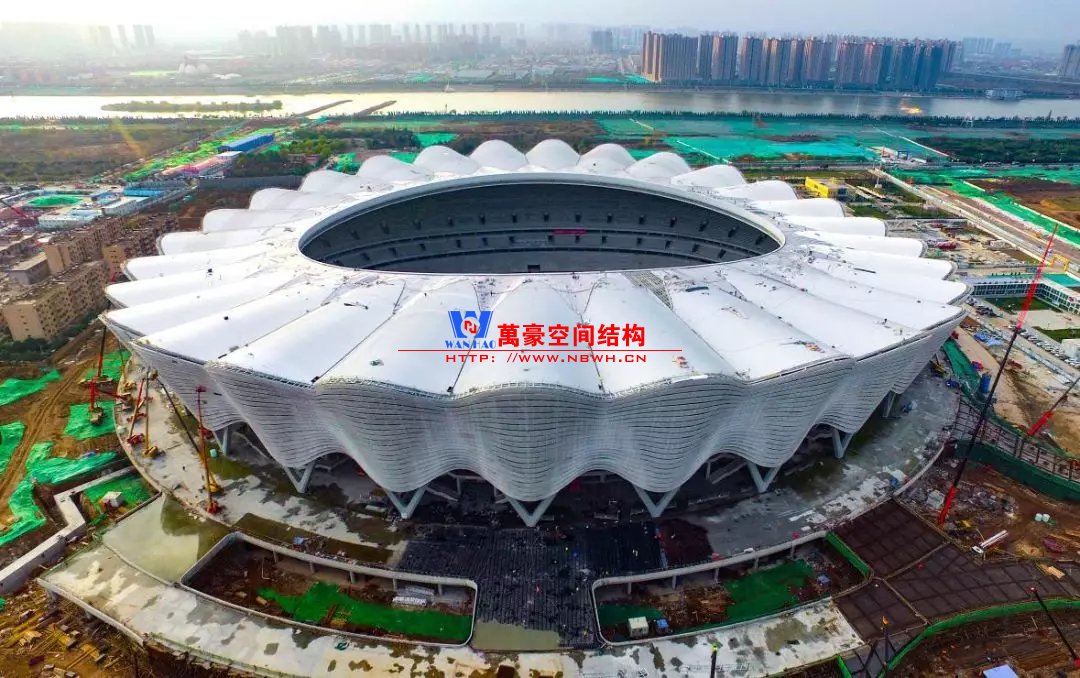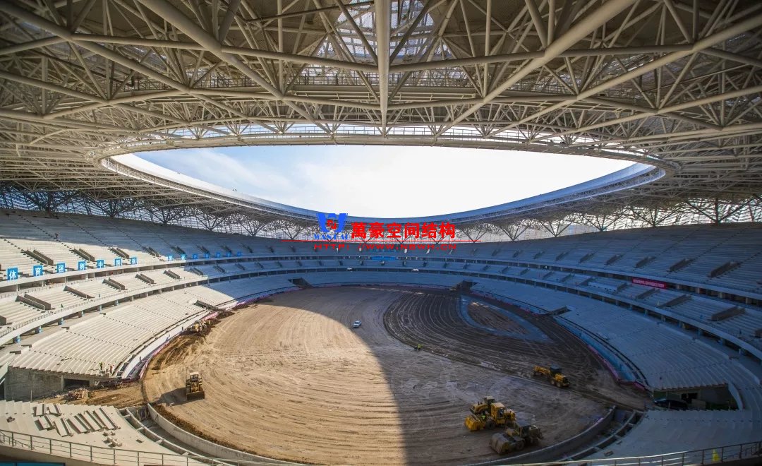 體育場主體建筑為南北長332m、東西寬316m的橢圓形,鋼結構罩棚最高處高58.3m,最低處高42.6m;中間開口南北長200m、東西寬153m。主體鋼結構采用空間懸挑鋼桁架結構,由28個V形柱支撐72片鋼結構管桁架,整體東西高,南北低,呈馬鞍形,體育場看臺為框架-剪力墻體系。屋頂圍護結構為鋁鎂錳直立鎖邊金屬屋面,罩棚立面采用銀白色穿孔鋁板幕墻系統,通過有韻律的變化,表達了絲綢飄舞的動感,輕盈通透的罩棚在夜晚能夠透出賽場內熱烈的賽事氣氛,宛如皓月長空下綻放的盛世之花。碗型看臺分為上、中、下三層座席,并在中上層看臺之間設置包廂層(包括66個大小包廂)及其座席區,觀眾分別由各層看臺對應的通道進入。