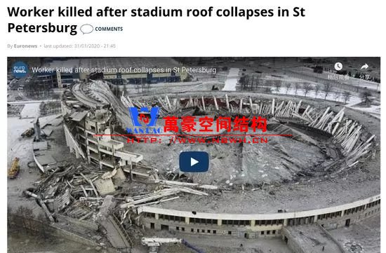 據外媒報道,俄羅斯圣彼得堡一個大型體育館的屋頂在重建過程中倒塌。正在施工的兩名工人,一名設法逃入升降機,而另一名工作人員墜落遇難。