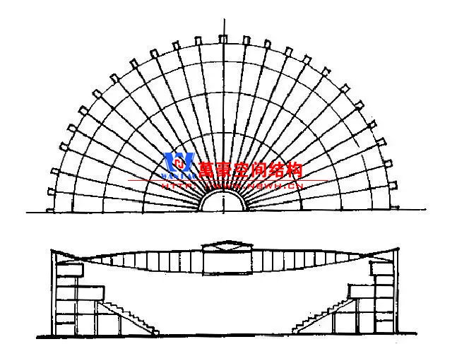 結構體系為輪輻式雙層懸索體系。外環直徑93m,內環直徑12m。輻射狀布置48組索桁架,索桁架高跨比1/17,承重索直徑63mm,穩定索直徑42.5mm。鋼筋混凝土外環截面2.8m*0.62m,屋面為4mm厚有肋薄鋼板。沿環向與豎向腹桿對應處,布置了兩圈豎向鋼板支撐體系,提高了結構整體性能,減低了自身高度。屋蓋用鋼量99.3kg/m2。