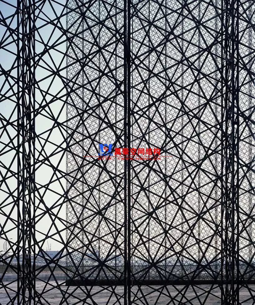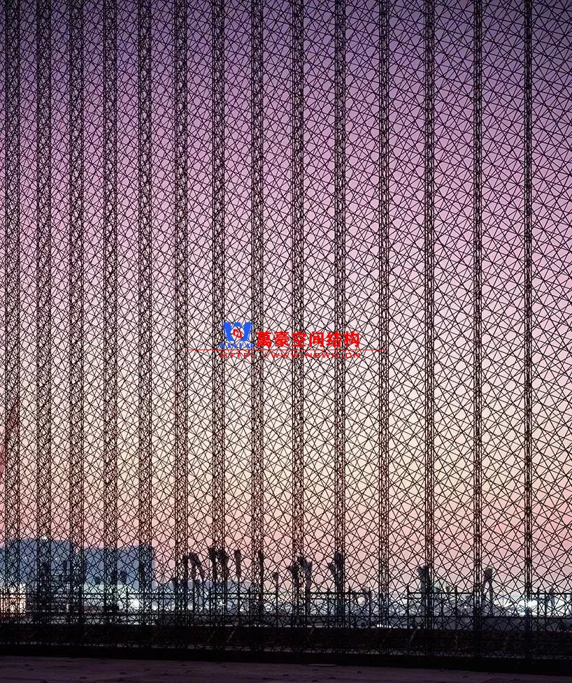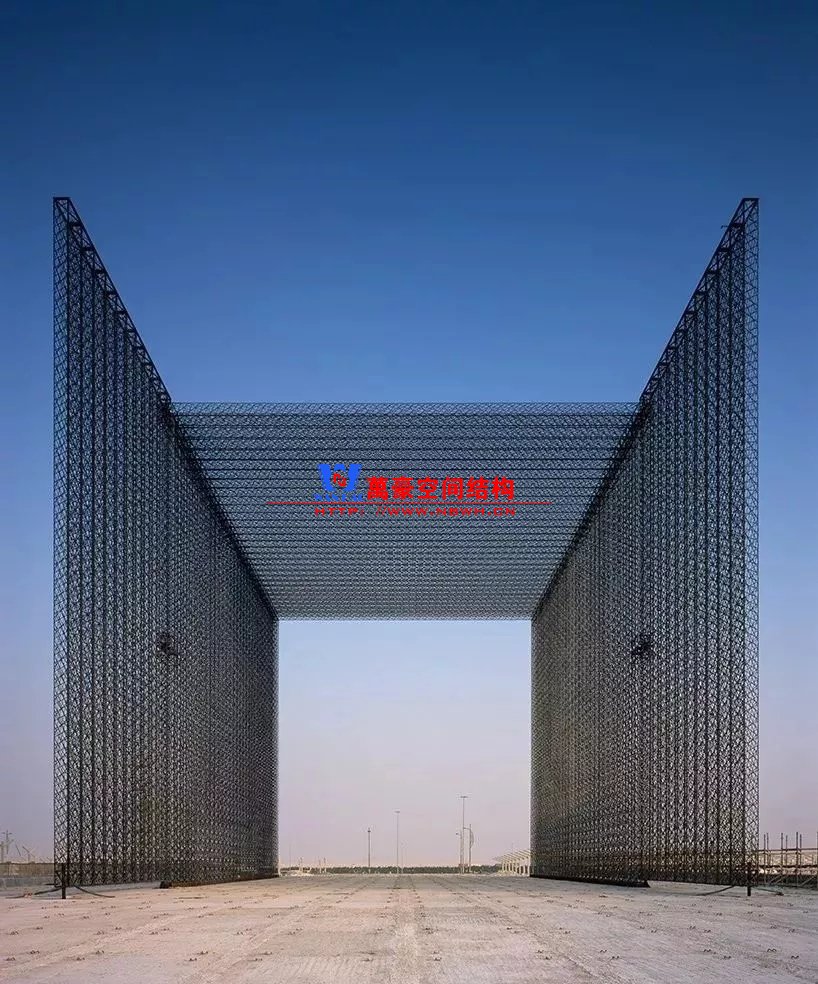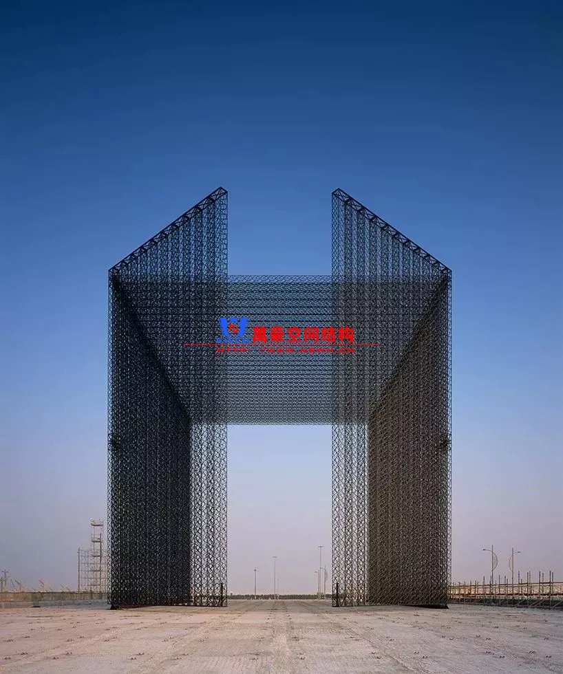 這三座大門完全由超輕的碳纖維混合絲編織而成,具有很高的結構強度。事實上,這使得每一扇大門在無額外支撐的情況下能達到21米高,30米長。每一座大門有兩扇巨大的門構成——21米高,10.5米寬,將在2020世博會期間的每個清晨打開以迎接從世界各地來的游客。它們被分別置于場地的三個區域——機遇、移動和可持續性,而且,一旦進入,人們將被引導至樹木蔥郁的到達庭院,該庭院同樣是由 Asif Khan 設計。