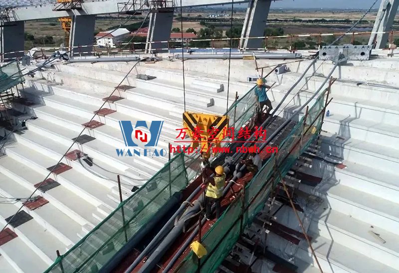 走進援柬埔寨國家體育場,現場張拉施工正在如火如荼的進行,最長達160米的巨型鋼索綿延環繞在體育場四周,猶如盤踞的巨龍。兩個高達99米的人字形吊塔一端拉起18根斜拉索,另一端連接8根背索,與索桁架共計1100鋼索將看臺罩棚高高擎起。從空中望去,猶如在一把天傘被中部鏤空,再被兩把豎琴輕輕吊起,整體結構氣勢恢宏,美輪美奐。目前,體育場罩棚索網張拉施工已圓滿完成。
