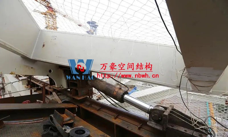 滑移前,事先設置滑軌,鋼橋兩端各安裝1臺-2臺液壓千斤頂和同步傳感器,從2個平臺分別向兩側頂推滑移,每滑移6米要進行鋼索張拉,確保屋面結構穩固,最終將屋蓋滑移到設計位置。
