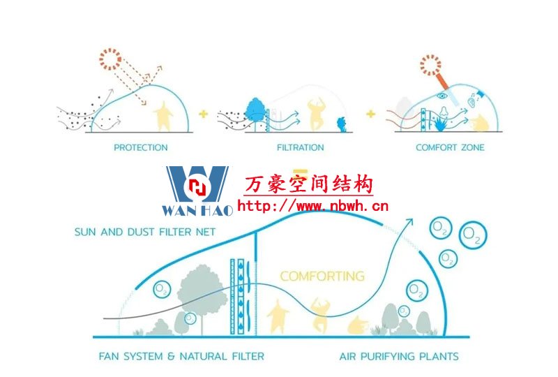 這些技術(shù)包括:使用風(fēng)扇釋放熱量,并產(chǎn)生氣流;將膜材包裹建筑,以獲得具有彌散而模糊效果的室內(nèi)光線,這對我們的雙眼十分友好;采用加濕器以保持50-70% 的室內(nèi)濕度水平。此外,植物的自然氣味和充滿實(shí)驗(yàn)性的音樂——由類似大自然的聲音(如微風(fēng)聲、水聲、鳥鳴)組成——也被用來提供舒緩輕柔的體驗(yàn)。這些方法可進(jìn)一步應(yīng)用于解決其他類型設(shè)計(jì)中的空氣污染問題。