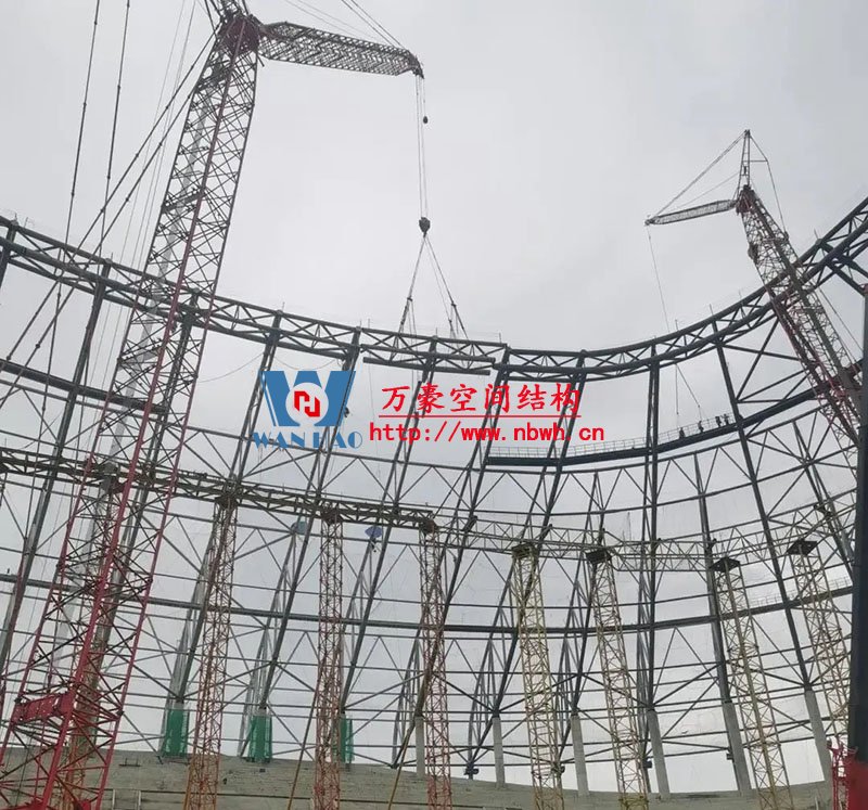 鋼罩棚平衡區長度27m,內部主桁架懸挑長度最大達58m。懸挑部分位于看臺上方,安裝高度高達59.5m。單榀桁架最大單重55t,單根鋼柱重量達60t。