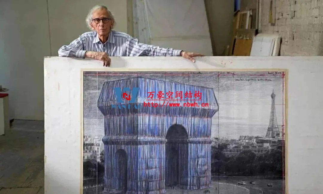 這是已故藝術(shù)家克里斯托和珍妮-克勞德的設(shè)計(jì),他們60年前的瘋狂夢想終于變成了現(xiàn)實(shí)。這一項(xiàng)目的運(yùn)營總監(jiān)、克里斯托的侄子弗拉基米爾·亞瓦切夫解釋道,閃閃發(fā)光的布料和鮮艷的繩子是克里斯托對法國藍(lán)白紅國旗的“詩意解讀”。亞瓦切夫和叔叔克里斯托共事長達(dá)30年。亞瓦切夫在一次視頻采訪中說道:“他喜歡能隨著天氣和時(shí)間而變化的顏色。這種布料讓人想起巴黎的屋頂……那種銀灰色。”