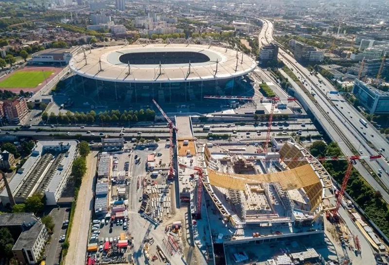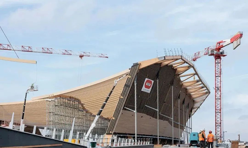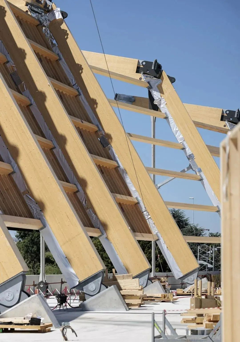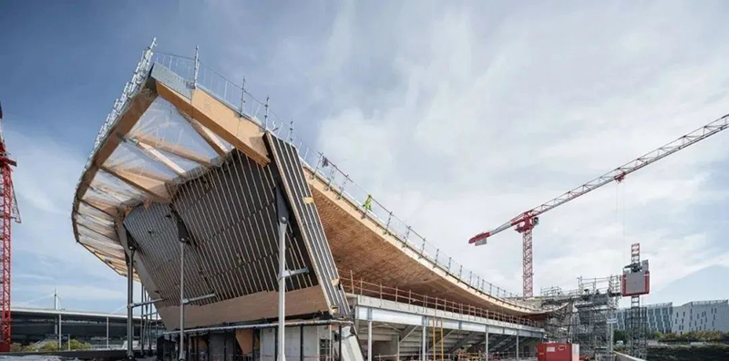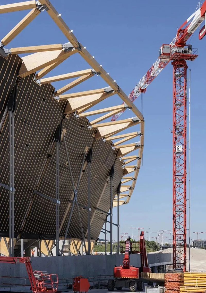木材是典型的生物基建筑材料之一,是該建筑的主要結(jié)構(gòu)材料。因?yàn)槟静谋绕渌牧希ㄈ缁炷梁弯摬模┧a(chǎn)生的二氧化碳排放量更少,正好迎合巴黎舉辦歷史上最可持續(xù)的運(yùn)動(dòng)會(huì)的目標(biāo)。通過在這個(gè)巨大的結(jié)構(gòu)中使用木材,該方案將生物材料的使用比例提高了一倍。