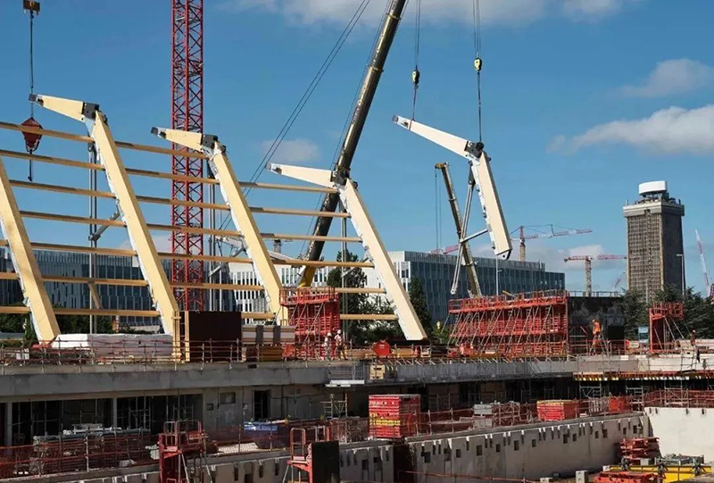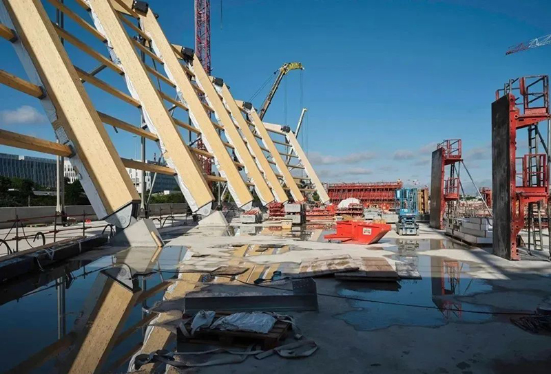 20 根預(yù)制主體木撐桿高 15 至 20 米,重 17 至 23 噸。解決了橫跨 90 米的大跨度的問題,構(gòu)成了令人印象深刻的木制勁性懸索結(jié)構(gòu)。