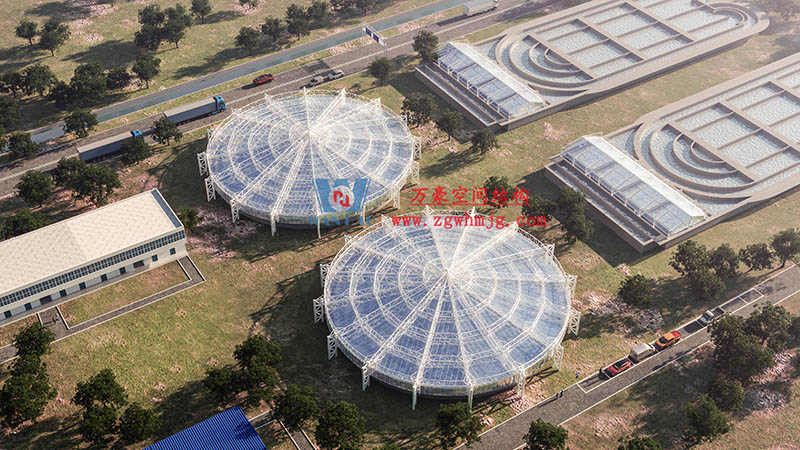 隨著工業(yè)技術(shù)的不斷成熟,污水池加蓋一般采用反吊膜結(jié)構(gòu)形式,對污水池內(nèi)廢氣進行處理。這種結(jié)構(gòu)采用膜材反吊的原理,將鋼結(jié)構(gòu)至于膜材外層,這樣,就有效的避免了池內(nèi)廢氣對鋼結(jié)構(gòu)的腐蝕,延長了鋼結(jié)構(gòu)的使用壽命,提高了反吊膜結(jié)構(gòu)的廢氣除臭率。膜結(jié)構(gòu)污水池加蓋方式新穎,采用膜反吊的形式,不僅造型新穎外形美觀,而且適應(yīng)于各種環(huán)境的大跨度池體建筑,比傳統(tǒng)的污水池加蓋更加堅固,也可以解決傳統(tǒng)加蓋方式在大跨度池體上施工困難的問題,更受到污水池工程的喜愛。