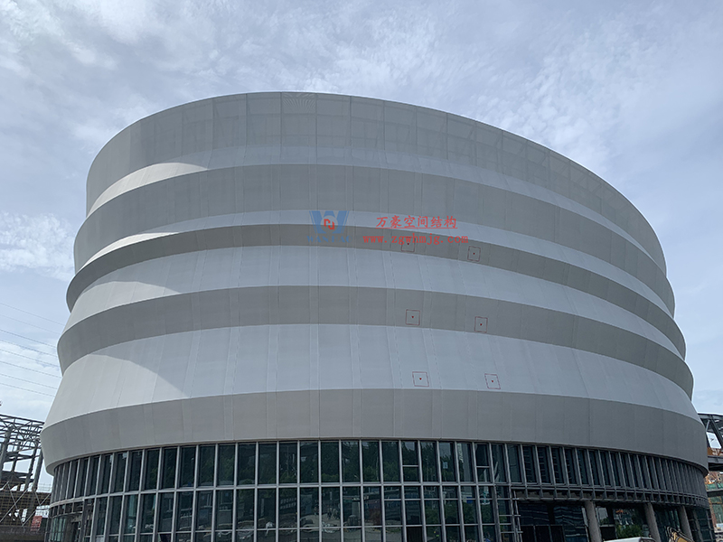 由萬豪承建的紹興國際會展館中心外立面網格織物膜,由5凸5凹不同標高的柔線組合成飄絲帶,視覺效果極具沖擊力。