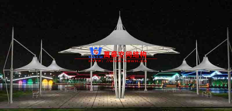 膜結(jié)構(gòu)遮陽棚工程頂棚面重量僅為常規(guī)遮陽棚的1/30,這就降低了基礎(chǔ)的造價(jià)。同時(shí)膜結(jié)構(gòu)工程奇特的造型和夜景效果有明顯的“建筑可識性”和商業(yè)效應(yīng),其價(jià)格效益比更高。