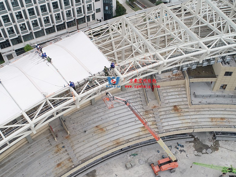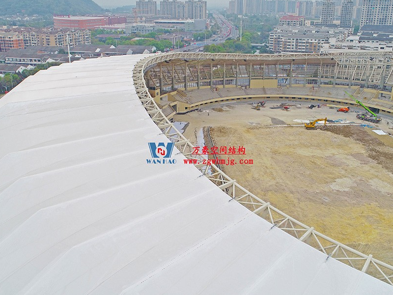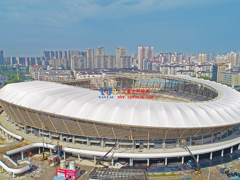 平陽體育中心設計功能為1.5萬座中型乙級體育場及其配套用房,總建筑面積49610平方米,其中鋼結構約3800噸、PTFE膜結構展開面積約25000平方。體育場鋼結構工程鋼柱采用箱型焊接截面,屋蓋采用19種不同跨度懸挑鋼桁架結構,節點均采用相貫焊接節點。屋面覆索膜結構,PTFE膜結構的使用,增加了整個體育場的空間感和動態感,也讓體育館成為了平陽當地的視覺焦點。