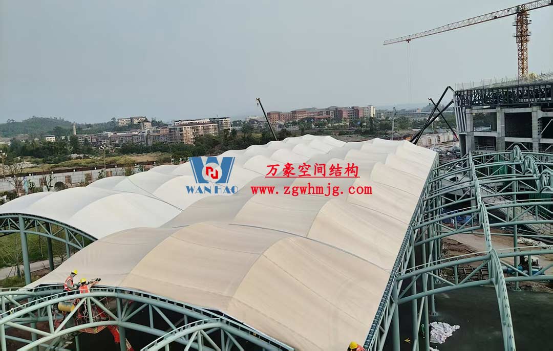 四川廣安共享體育場網球館膜結構位于廣安區官盛新區,是廣安共享體育場的一部分,PTFE膜結構展開面積5500平方米