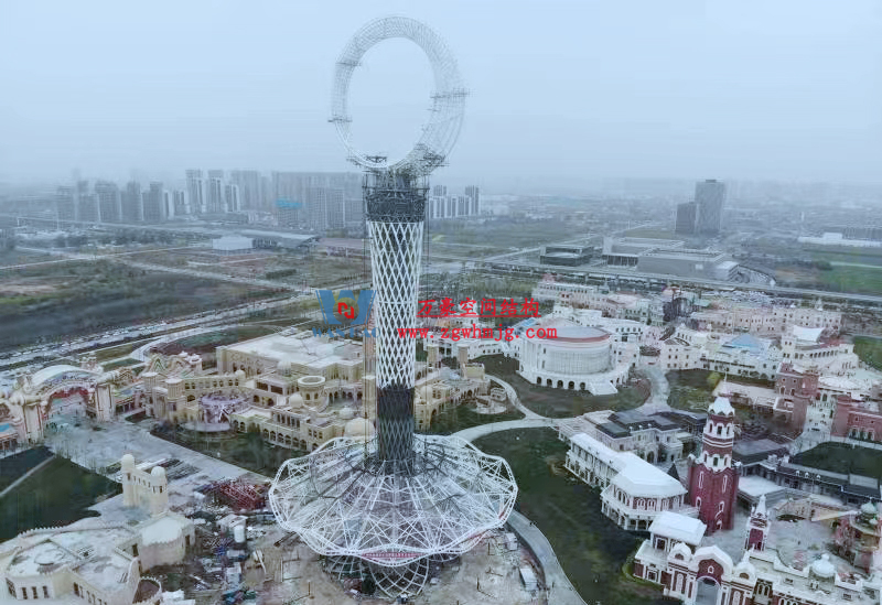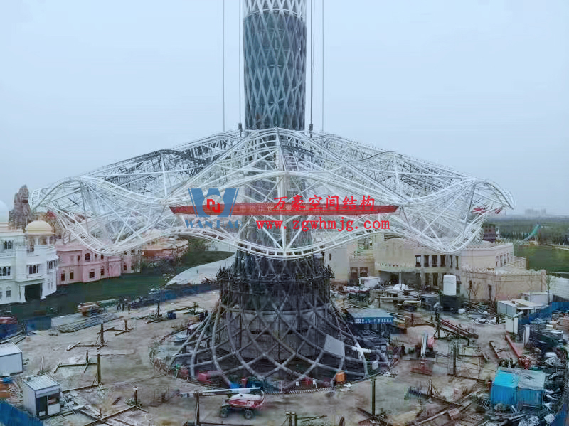 近日,作為絲路歡樂世界的地標建筑,I TOWER的裙擺部件已經提拉安裝完畢,遠處望去,整個工程主體效果已基本顯現!