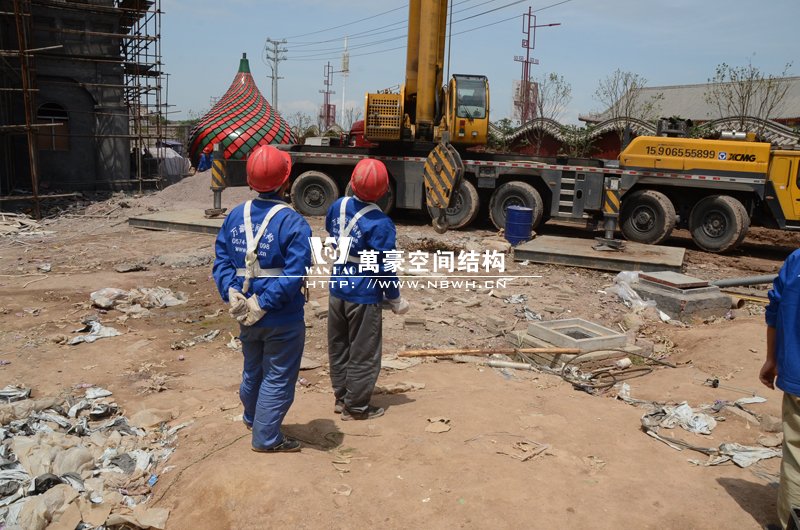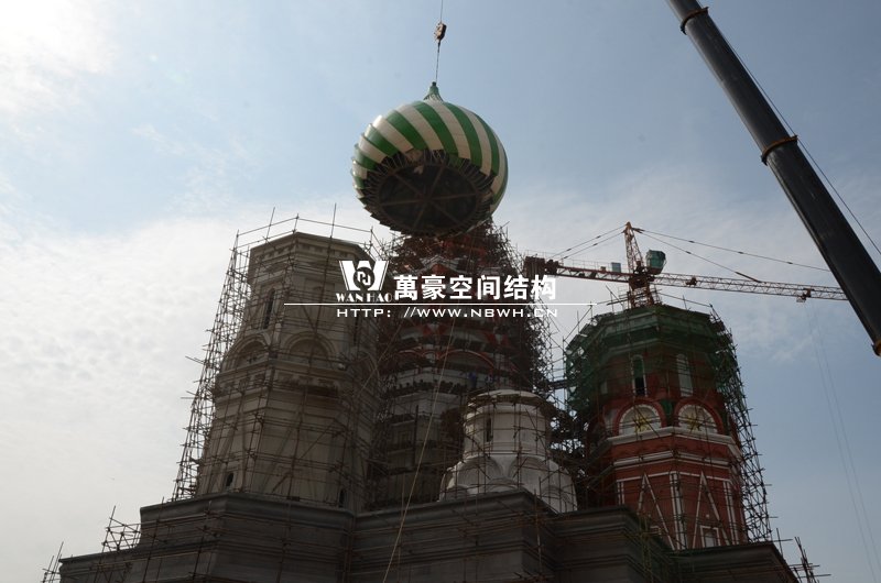 我司承建的橫店影視城圓明新園俄羅斯館已經(jīng)進(jìn)入頂部吊裝階段,本次吊裝難度極大,有著重、高、精等特點。本次吊裝的球體采用鋼結(jié)構(gòu)骨架加鋁合金外殼組成,自重很大,同時球體在吊裝過程不能變形,對球體前期的設(shè)計制作要求高,因其重量大,所以使用了大噸位吊車。本次吊裝高度高,很多都是高空作業(yè)。同時本次吊裝精度要求高,需要球體和底座按照設(shè)計要求完美結(jié)合,一次性完成吊裝,需要吊裝人員做好協(xié)調(diào)溝通工作,配合毫無誤差。4月17日天氣晴朗風(fēng)速低,是吊裝的有利天氣,首先吊裝相關(guān)人員設(shè)備做好準(zhǔn)備工作,之后先吊裝1號球體,在1號球吊裝完畢無誤固定后再吊裝5號球體,當(dāng)天吊裝好1號球體和5號球體。