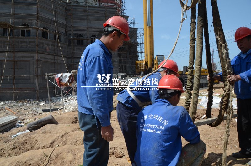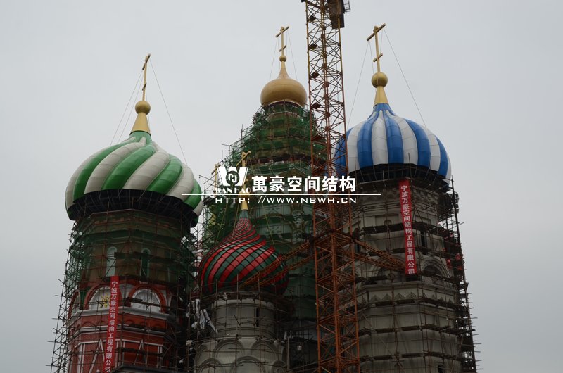 橫店圓明新園俄羅斯館屋頂整體吊裝順利完成,300多噸的大吊車,20多噸重的鋼結(jié)構(gòu)裝飾球,80米高的作業(yè)平臺(tái),在萬豪現(xiàn)場管理人員和工人的緊密協(xié)調(diào)下,經(jīng)過一周的晝夜努力終于大功告成,本次吊裝從4月17日開始,前期天氣晴朗無風(fēng),是吊裝的好天氣,吊裝也是順利進(jìn)行,之后的幾天陰雨不斷,大家為了吊裝盡快順利完成,在雨小的時(shí)候冒雨進(jìn)行吊裝,終于在4月22日吊裝正式完成。