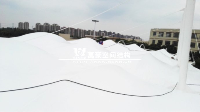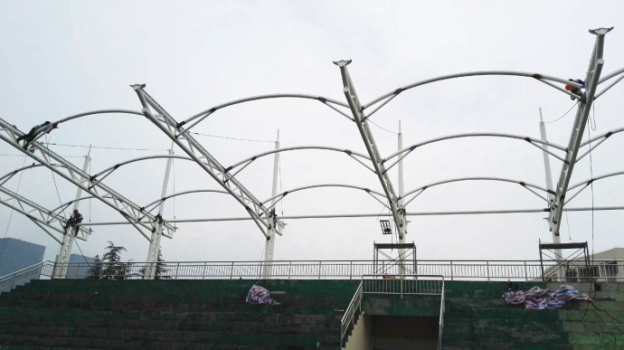 項(xiàng)目坐落在上海市青浦區(qū)公園東路1100號(hào),上海市青浦高級(jí)中學(xué)運(yùn)動(dòng)場(chǎng)內(nèi)。由15根雙立柱支撐,15榀桁架懸挑均勻受力及14塊跨度較大的意大利進(jìn)口耐馳二氧化鈦NZ-1400-3膜材張拉而成。鋼構(gòu)總重約100噸,膜面積約2100平。