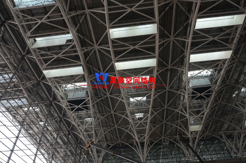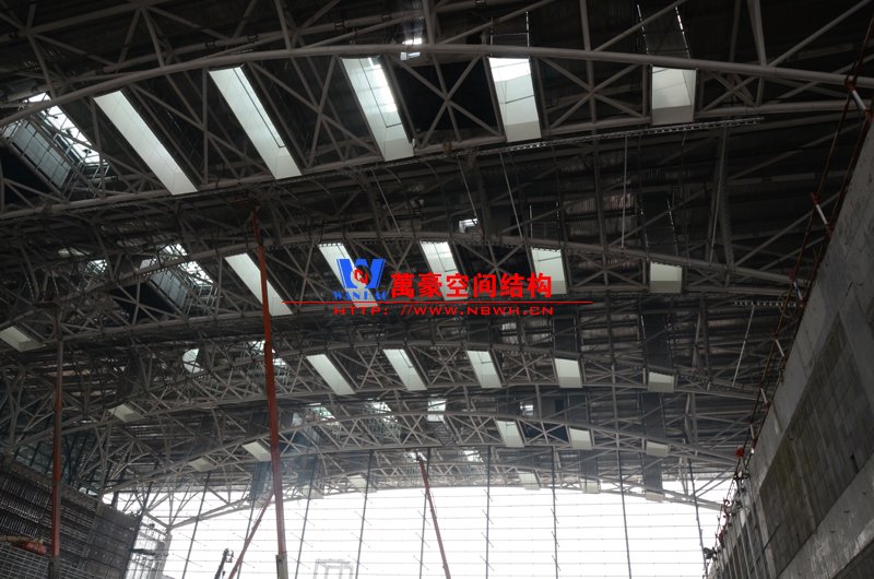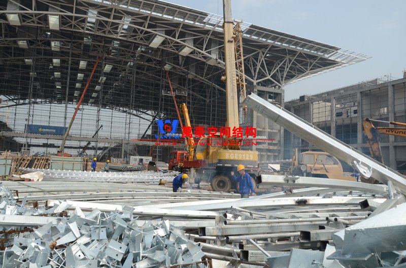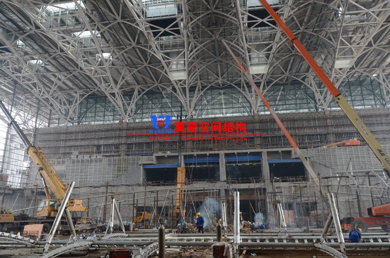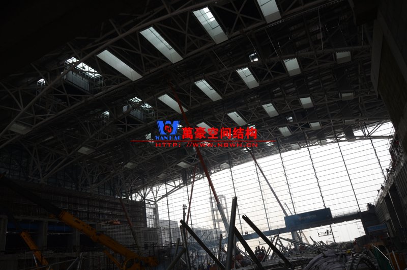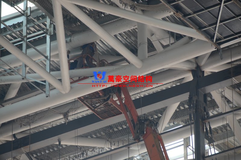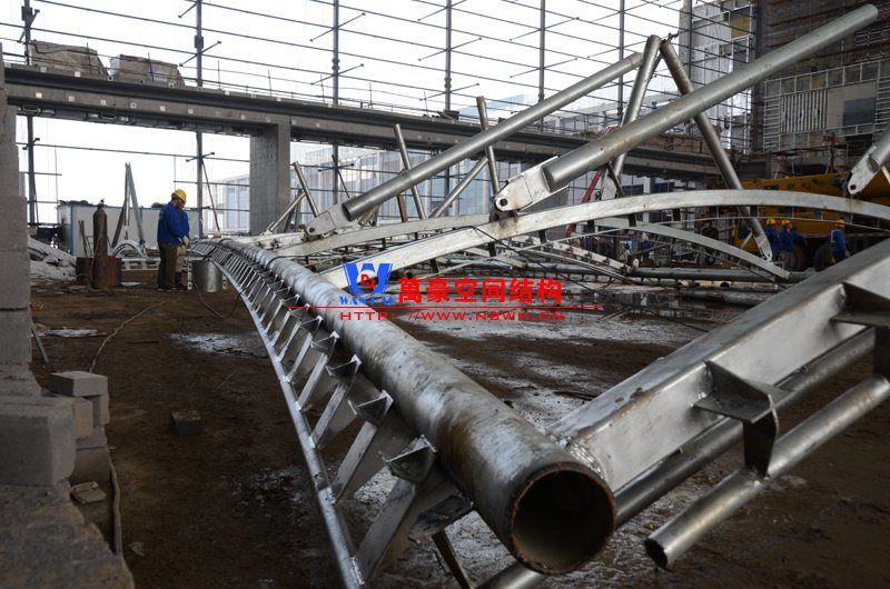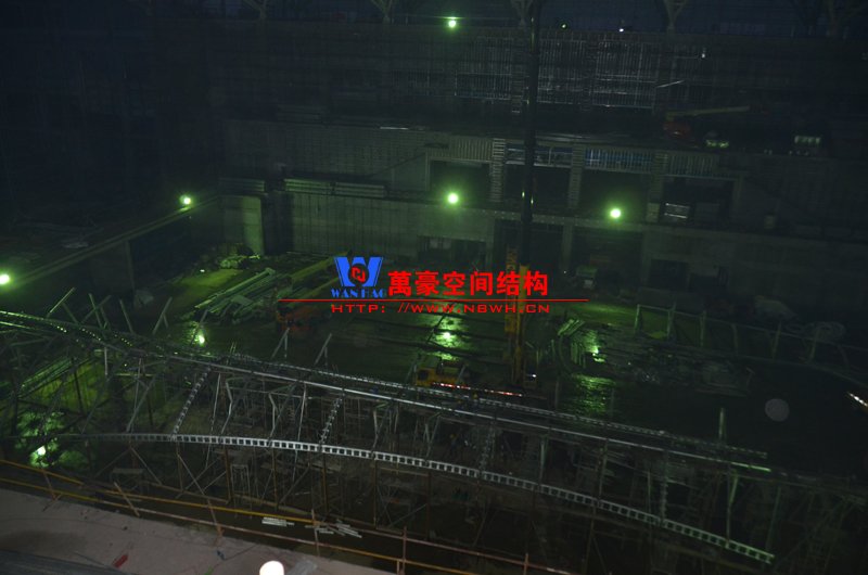 該膜結構由內外兩部分膜組成,所有鋼構件及膜材均采用吊頂反裝式,主體結構高度達40米。施工現場吊裝難度非常大,因采用PTFE材質內外膜,對整體鋼結構精度要求非常高。我們現場鋼結構施工過程中均委派專業計量人員及質檢人員全程參與數據實時復核以提高精確度。因本項目作為青島市標桿項目,工期急,工藝要求高,我司作業人員基本采用24小時輪班工作制,節假日全部無休,只為早一天將此項目順利竣工交付給業主單位。