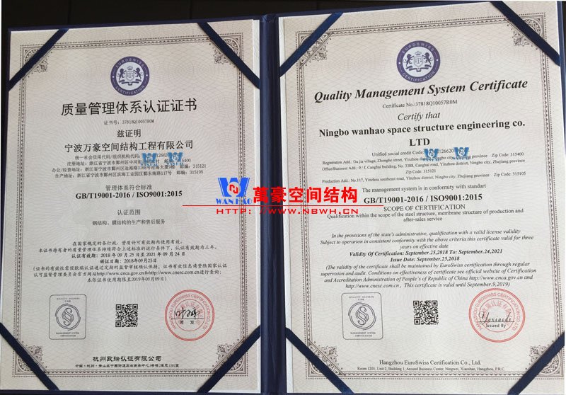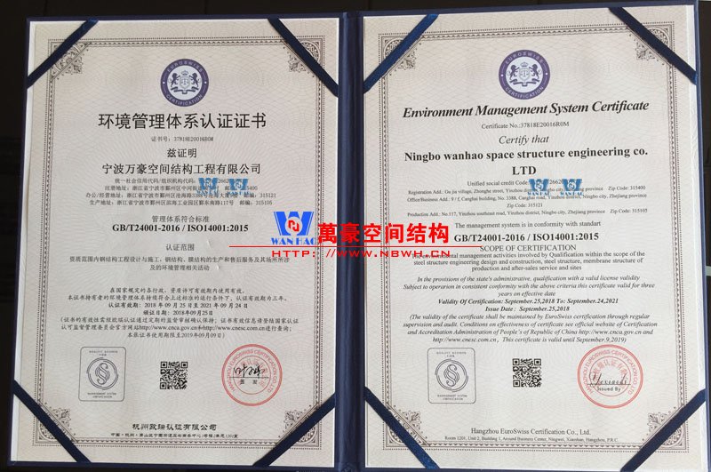 最近,寧波萬豪空間結(jié)構(gòu)工程有限公司進行了最新一次的質(zhì)量管理體系認證審核,各項指標自然是符合要求,順利的拿到了4項管理體系認證證書,大家可以見證一下。