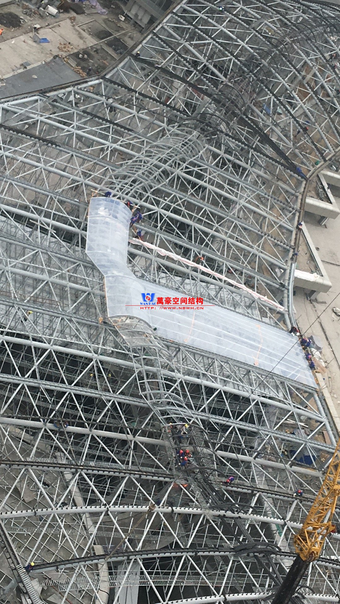 經過不斷的日夜加班,遵義高鐵新城天幕膜結構工程目前進入到膜材安裝階段。